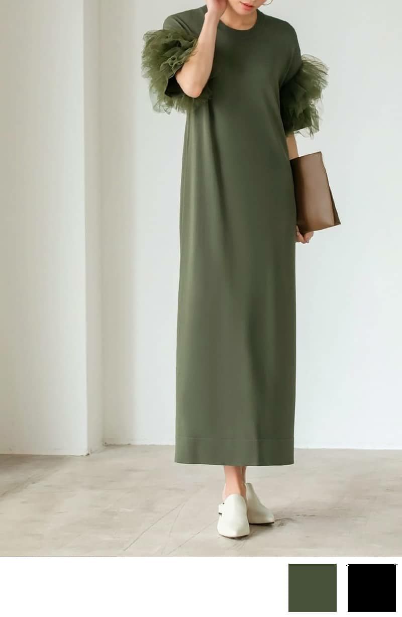 【OUTLET】ボリュームチュール袖ロングニットワンピース
