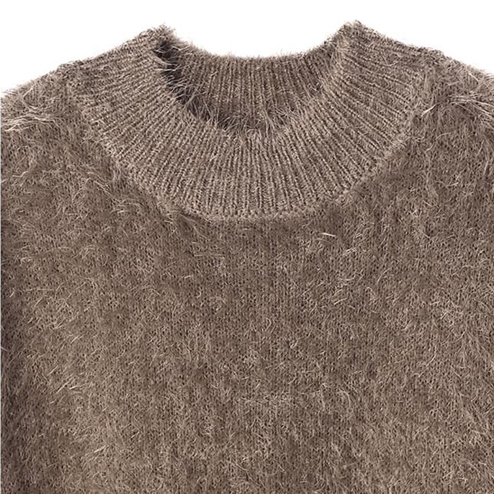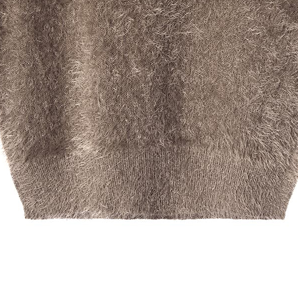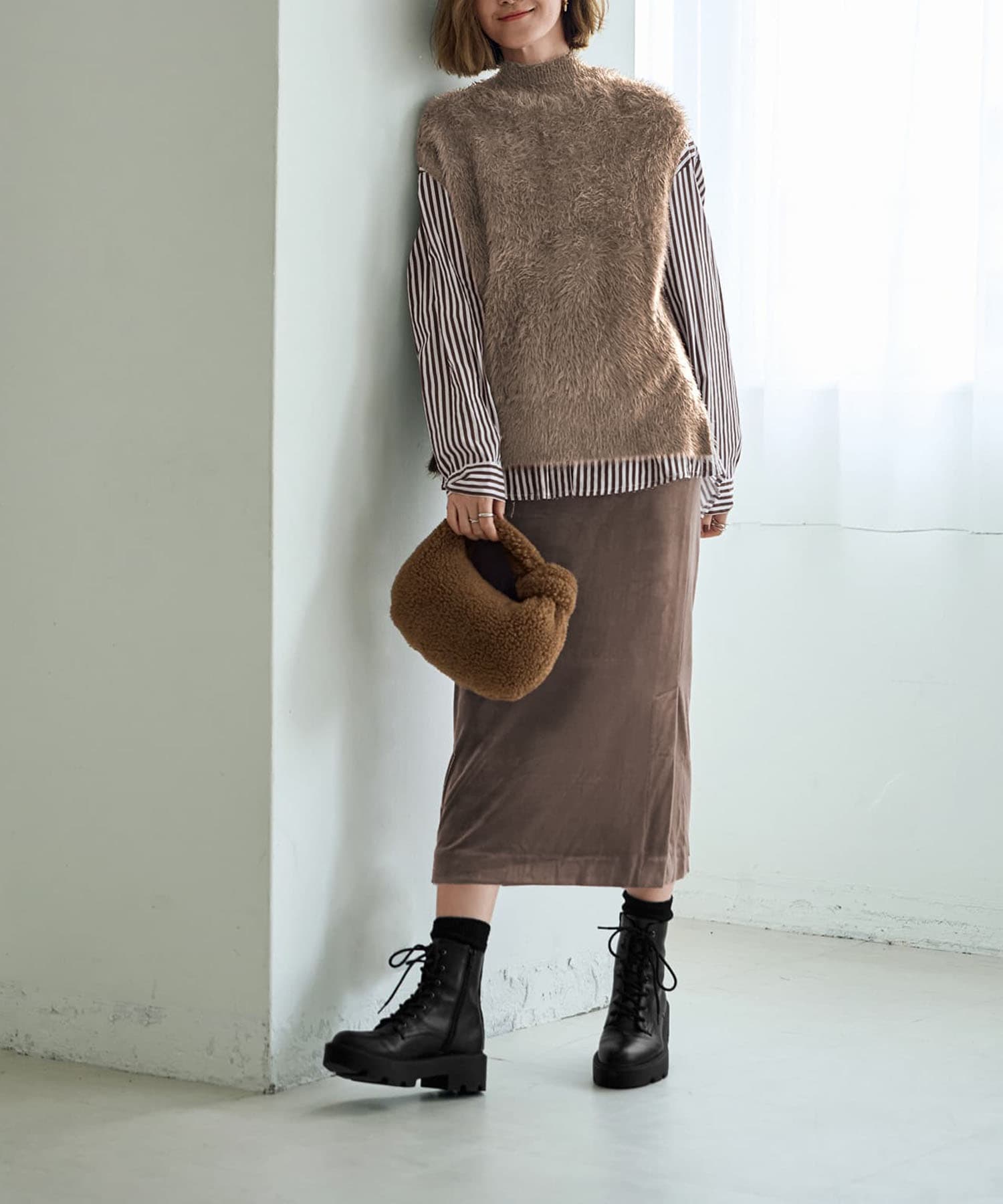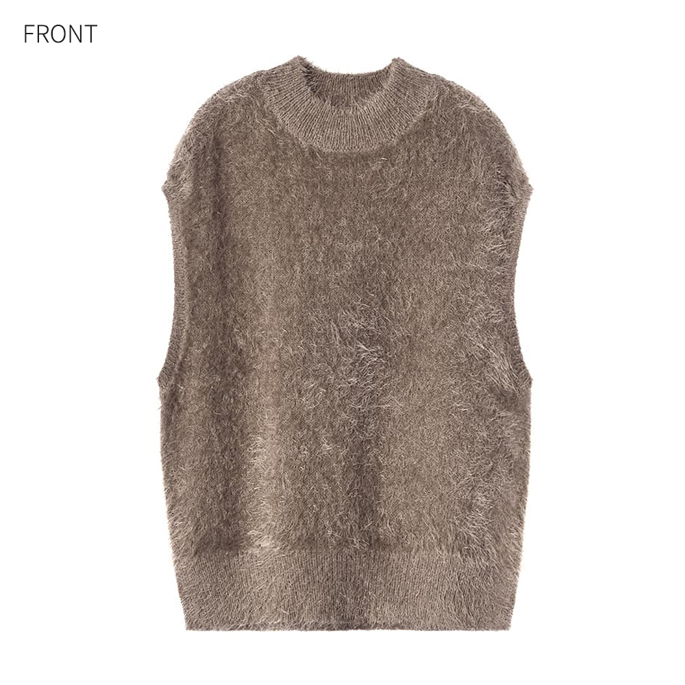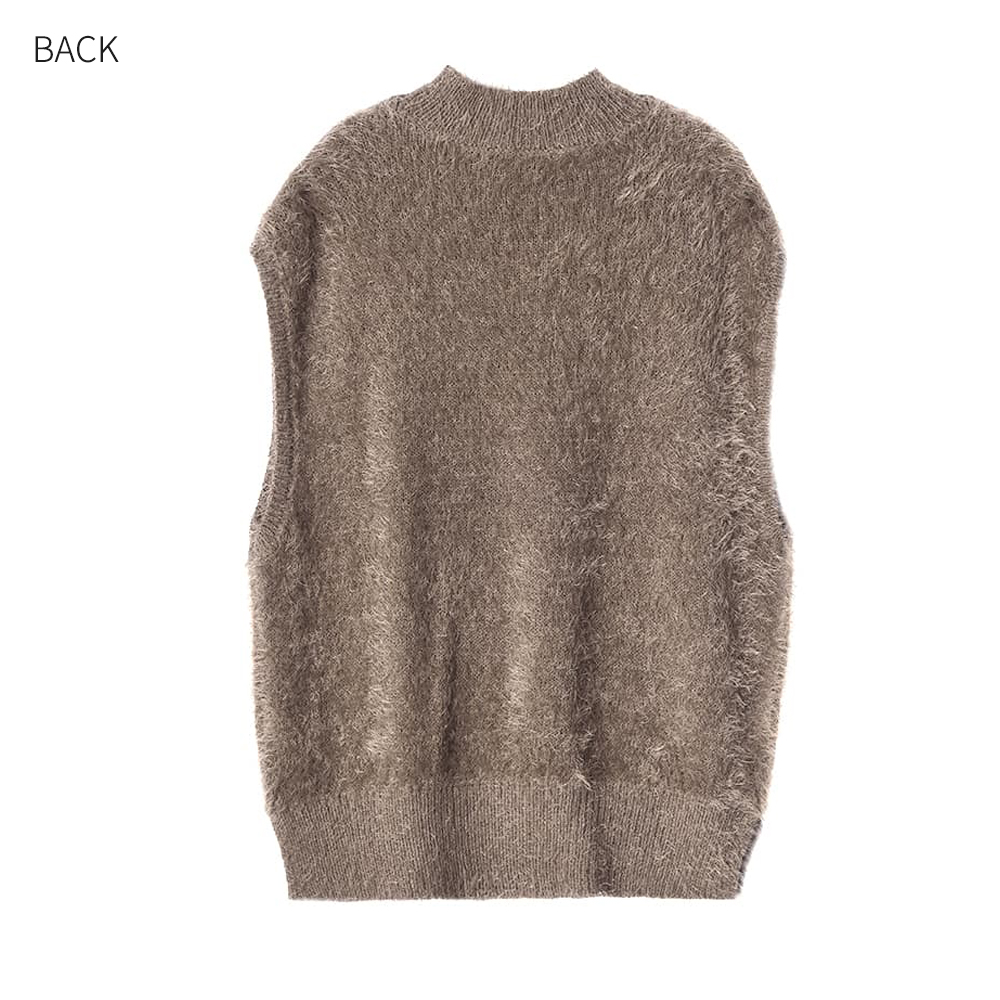 毛が飛ばない&薄手で膨張しないしっとりなめらかな手触りで快適なフワフワシャギーのニットベスト【このベストの特徴】◆質感の良いシャギーニット地で仕上げたハイネックベスト。毛が抜けない・飛ばない・付かない/チクチクしない/毛玉ができない。という、扱いやすさに優れた点もご支持を受けているロングセラーアイテムです。◆こういった素材系のベストで心配な『猟師さんみたい』『クマみたい』『太って見える』を全てクリアするよう、思案を重ねた自信作。ハイネックや袖ぐりのカタチでスタイリッシュに見えるよう細かく計算し、素材の力で膨張見えも回避しています。◆フワフワとはしていますが意外と生地は薄く、厚みがないことで身体がぶ厚くならないのが秀逸。バストが大きめな方でもそれが目立たず、もっと膨張するかと思った…!と嬉しい驚きのお声をいただいています。◆首の短さを強調しない、高さ控えめで着やすいハイネック。猟師さん見えしないヒミツの要素もココにあり(あっち系のベストにハイネックは無い)、中途半端に肌を見せないことが膨張しないコツでもあります。そして首が冷えないのも地味に◎◆パンツでもスカートでも合う万能系シルエット。お手持ちのワンピースに重ねても良く、いつものお洋服をオシャレに味変しつつ、暖かさもUPしてくれるアイテムです。【生地について】◆表面はふわふわと毛足感のあるシャギーニット。裏側は普通のニット地で厚みがでないため、スッキリ着ることができます。◆毛が抜けない・飛ばないところが最大の利点にして愛されている特徴。ファー素材とは異なり手洗いができる点も便利です。◆しっとり・なめらかな触り心地。チクチク感は皆無の快適なお素材。ずっとなでなでしたくなる、とご好評をいただいています。◆とてもよく伸びますがキックバックは強過ぎず、身体にピッタリとしないところも着やすさのポイントです。◆着ていて丈が伸びることはありませんが、ハンガー掛けでの重力には強くないためたたみ保管がお薦めです(シワにはなりません)。【その他仕様などの情報】◆着用時期:10-2月が目安◆サイズ感:適度なゆとりがあるサイズ感(Lサイズ体型にも対応)◆丈感:前は脚の付け根程度の丈感/後ろはヒップにかかるくらいの長さ◆シルエット:ストレート◆首元:ハイネック◆肩幅:問わないタイプ◆アームホール:広め◆厚み:普通(厚ぼったさはナシ)◆柔らかさ:柔らかい◆肌触り:しっとりして柔らかな感じ◆着用ジワ:できにくい◆毛羽立ち:できにくい◆伸縮性:あり◆光沢感:僅かにあり◆透け感:なし◆ボタンやファスナー:なし(かぶり着タイプ)◆スリット:両サイドにあり◆裏地:なし◆手洗い:可能◆アイロン:不要◆スチーマー:使用OK【お色について】◆ブラック:通常の定番的なブラックです。微光沢があるため、一般的なブラックよりは少し明るく見えます。カッコいい感じにも着こなせるので、クール系コーデがお好きな方にも人気です。◆トープ:赤味の無い、グレイッシュな感じのモカブラウン。クマさんに見えず太って見えないよう、考え抜いたお色です。 【SNS用ハッシュタグ】#234489ふわふわシャギーハイネックベスト(このハッシュタグでInstagramなどSNS内で検索をしますと、こちらをお持ちのお客様のご投稿があれば、簡単に見つけてご覧いただくことができます)