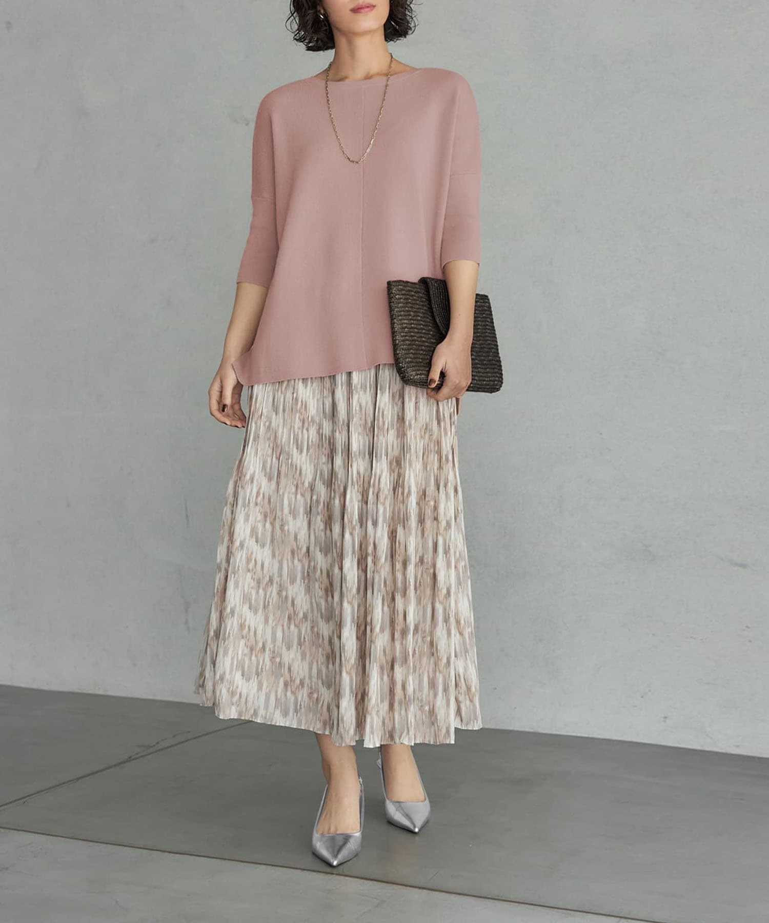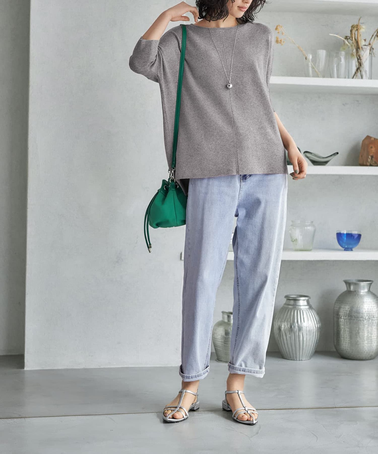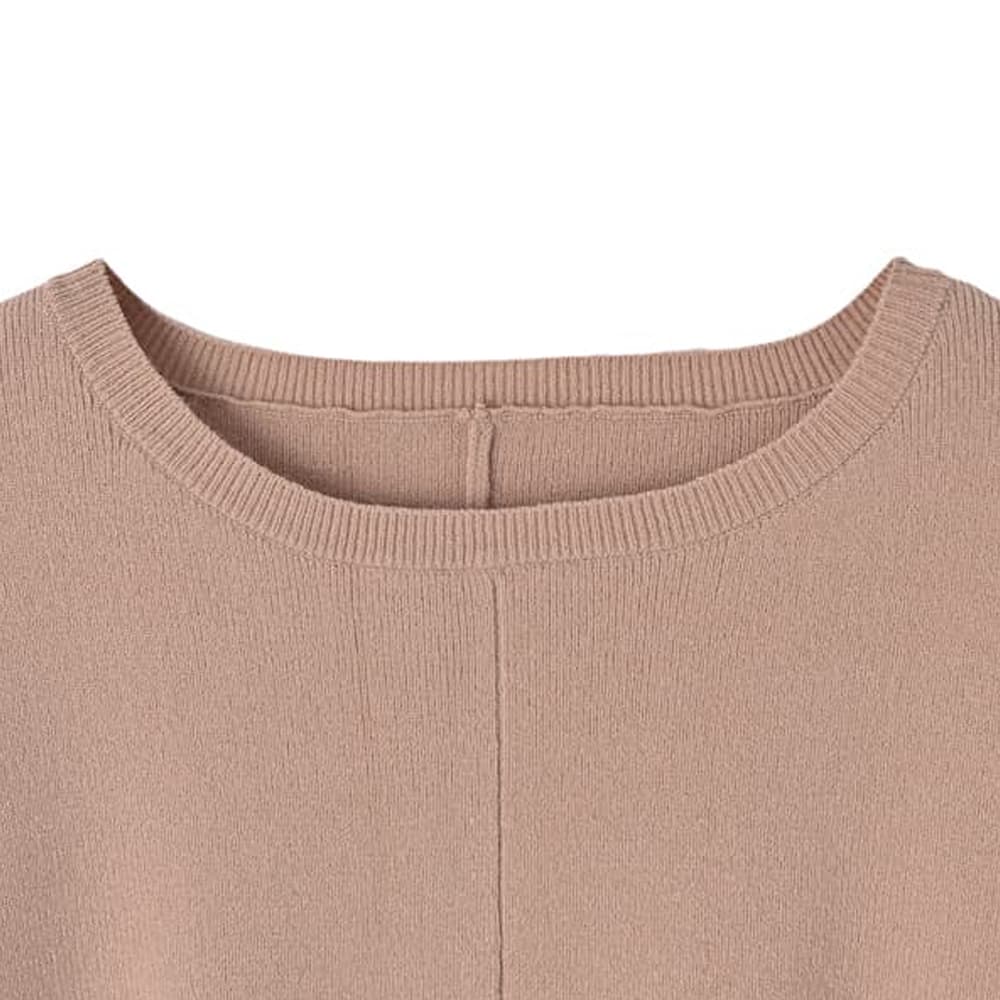 柔らかな空気感が魅力の『ソフトタッチ』ー8分袖のドルマンスリーブニットトップスー ほんわりとエアリーな質感で軽い着心地。毛羽立ちしにくくチクチク感もない、柔らかな『ソフトタッチ』ニットシリーズです。このシリーズは弊社社長が早期に大量の糸を買い付けることで、お買い求めしやすい価格を実現したニットたち。いつもよりお気軽にお楽しみいただけるお薦めのシリーズですので、ぜひ毎日のオシャレにご活用いただければと思います。【こちらのデザインは】着るだけで自然な女性らしさを感じるフォルムに仕上げた8分袖(※)のニット。ゆったりとしたドルマンスリーブから細い部分(手首)が見えることで、メリハリのあるバランスになるよう計算されています。首元はボートネック系の浅い首開きで、下着の肩紐が出にくいよう、横幅の開きは少し控えめに設計。前後差のある丈感で裾をアウトしてもバランスが良く、前は脚の付け根程度の丈感、後ろはヒップが半分隠れるくらいの長さでパンツにもスカートにも合います。上着に困ることが多いドルマンスリーブですが、こちらはそのドルマン具合も控えめな感じにしてあるため、大概のアウターであれば羽織れる優れモノ。ボディ部分はゆったりしており、体型カバー効果も期待できます。手首が見えるので、お気に入りのバングルや時計、ブレスレットなどもよく映えるニットトップスです。※肩幅や骨格、腕の長さにより、袖丈は6分から8分程度と個人差が出ますが、どの長さで着ても可愛いデザインです。※こちらは再公開商品です。過去のインスタライブでの紹介は2023年9/10のアーカイブ動画でご覧いただけます。【商品の特徴】◆着用時期:秋冬◆サイズ感:ゆったりとしたサイズ感◆丈感:脚の付け根程度の丈感◆シルエット:控えめなドルマンスリーブシルエット◆首元のデザイン:下着の肩紐が出ないボートネック◆厚み:薄くも厚くもない◆柔らかさ:柔らかい◆着用ジワ:できにくい◆毛羽立ち:摩擦の集中と着用頻度により、たまにおきることがあります(できた場合は毛玉取りクリーナー等でご対処ください)◆伸縮性:あり◆光沢感:なし◆透け感:なし(エクリュはそれなりに下着にご配慮ください)◆ボタン:なし◆ファスナー:なし◆ポケット:なし◆裏地:なし◆手洗い:可能◆アイロン:可能(低アイロン)【お色について】◆ブラック:通常の定番ブラックです。◆ピンク:ごく僅かにオレンジ要素を含んだ、甘くならない優しい大人ピンク。◆グレー:ライトグレーとも言える、明るめのクセがない定番的なグレー。◆ベージュ:赤味が入ったベージュ系ニュアンスカラー。ピンクベージュとも言えるお色。◆エクリュ:ほんのりクリーム色感が乗った、バニラアイスのようなお色。【SNS用ハッシュタグ】#235005ソフトタッチ8分袖ドルマンニットトップス(このハッシュタグでInstagramなどSNS内で検索をしますと、こちらをお持ちのお客様のご投稿があれば、簡単に見つけてご覧いただくことができます)