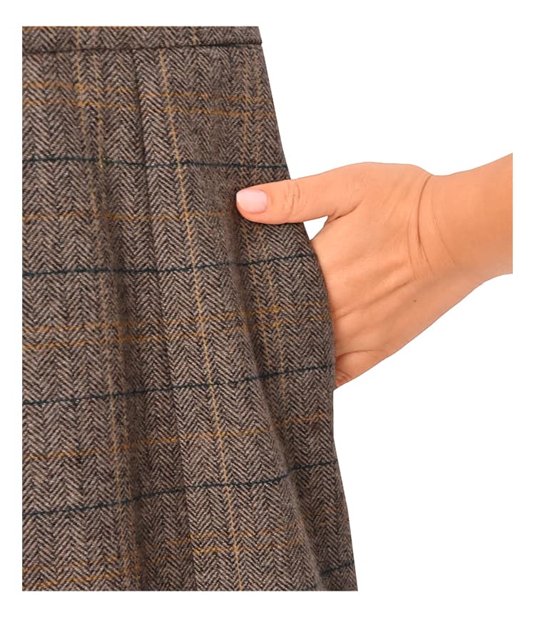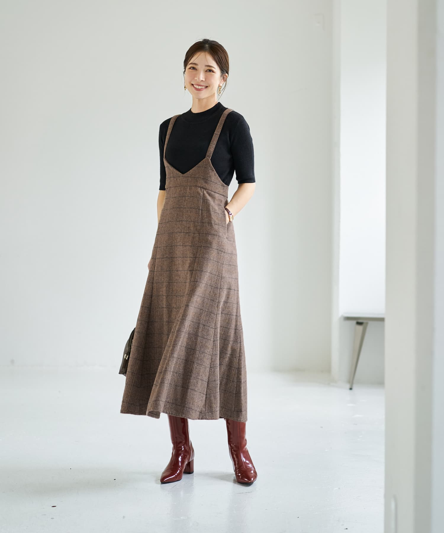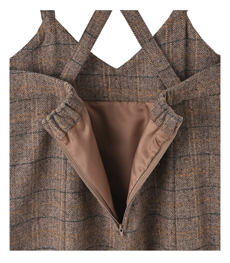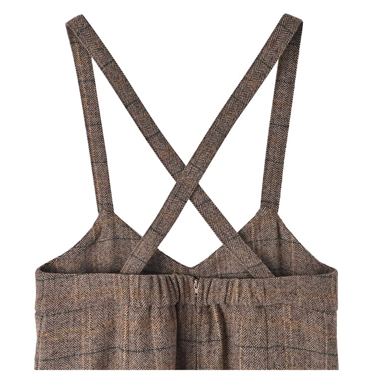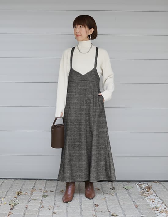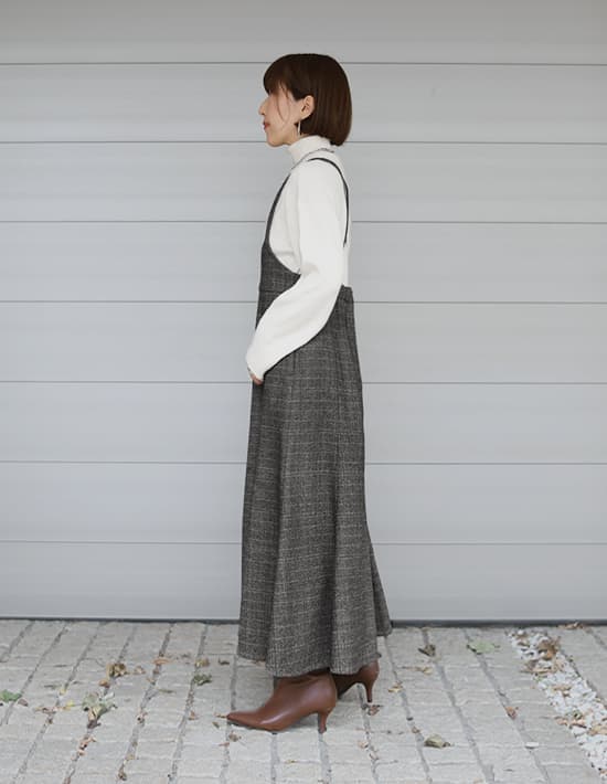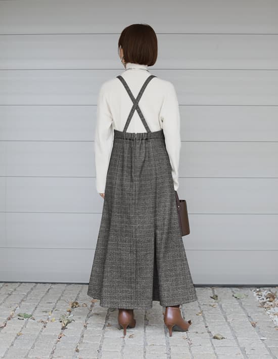 脱レトロな新感覚ヘリンボーン!暖かい美ラインジャンパースカート完成された美しいフォルムが素敵な、暖か生地のジャンパースカート。実際には締め付けが無いのに、ウエストがキュッと締まったメリハリボディに見せてくれます。フェミニン寄りなデザインをヘリンボーン生地のトラディショナルさが緩和し、媚び感のない女性らしさを楽しめるデザイン。マーメイドスカート特有の流れるようなラインも、歩く度に華が生まれて視線を惹きます。◆冬ならではの温かみがある質感を持つ生地。やや厚手で暖かさがあり、しっかりとしています。ウールを含有した良い生地ですが、ポリエステルをブレンドすることで使用感の良さをUP。チクチク感の回避やゴワつき、シワといったウール生地の懸念点をクリアしつつ、見た目(質感)の良さなどの利点は残した生地になっています。◆昔から普遍的に愛される伝統のヘリンボーン柄に、ポイントカラーで今風のアクセントを加えた『脱おじさん』なNEOヘリンボーン柄。チェック柄とヘリンボーン柄が共存した珍しいタイプで、とてもオシャレな印象です。ポイントカラーは生地の中に馴染むため主張の強さはなく、それでコーディネートがしづらくなることはありません。◆肩紐の取り外しはできません。※こちらは再公開商品です。過去のインスタライブ紹介は2023年11/28および11/30のアーカイブ動画でご覧いただけます。【着丈寸法について】こちらの商品はウエスト位置などに明確な決まりが無く、丈は肩紐で調節をして好きな位置で着るものですので、通常のお洋服のような着丈の概念がありません。身長については低い方でも高めな方でも対応可能な構造ですので、寸法に捉われずに大体の感覚でお考えいただければと思います。◆マーメイドスカートは丈が長すぎない方がバランスがキレイですので、デザイン的な推奨丈感は『短めのロング丈ーふくらはぎは隠れて足首はしっかり出る長さ』となっております。◆一応表記しております『着丈90cm』は、背面ゴム上から裾までの長さになります。ただしこのゴム位置がウエスト位置というわけではないため(※)、着丈90cmのスカートと同等ということではありません。※ゴム位置はどこにしてもご自由です。◆肩紐ベルトの背面側に丈感調節ボタンが3個あり、約4.5cm間隔で穴が開いています。一番着丈を長くするボタン穴は肩紐の端っこギリギリなのでこれ以上は伸ばせませんが、着丈を短くする為のボタンはお直し屋さんで追加することができます。◆ワンピースとは構造が異なりますため通常の着丈と同じようには考えることができませんが、大体の目安としての丈感を記載いたします。※平面で考えるとこのようになりますが、実際にはバストや肩の厚みなどで影響を受けていきますので、身体の薄い方と厚い方では同じ身長でも着用丈感が変わります。・短いボタン:着丈119cm程度のイメージ・真ん中のボタン:着丈123cm程度のイメージ・長いボタン:着丈127cm程度のイメージ【お手入れについて】こちらは天然素材含有の高価なオシャレ生地を使用しておりますので、あまり考えずにラフに洗ってしまうとトラブルの可能性も想定できますことから、万が一のことを考えて手洗いOK表記は付けておりません。◆そこまで汚れるものでもなく、1シーズンに1回クリーニングに出せば十分ですのでご利用がお薦めです。◆日常的な殺菌、消臭、シワ感などのお手入れはスチーマーで叶います。◆どうしてもご自宅で洗いたい場合は、『ウール生地 手洗い』などで検索をしていただき、ご自身のご判断の上で自己責任にて行っていただきますようお願いいたします(実際にやられる方は沢山いらっしゃいますので、手順を守れば難しくはないと思います)。 【お色について】※ポイントカラーは離れた位置からは見えないので、奇抜な印象にはなりません。 ◆チャコールミックス:チャコールグレーと薄いグレーのお色をメインに、ベージュ、ボルドー、ブルーの糸(ライン状のポイントカラー)が混ざったお色。◆ブラウンミックス:濃いブラウンとグレーをメインに、グリーン、オレンジの糸(ライン状のポイントカラー)が混ざったお色。【SNS用ハッシュタグ】#235186ヘリンボーンマーメイドジャンパースカート(このハッシュタグでInstagramなどSNS内で検索をしますと、こちらをお持ちのお客様のご投稿があれば、簡単に見つけてご覧いただくことができます)