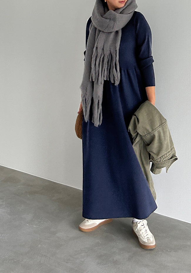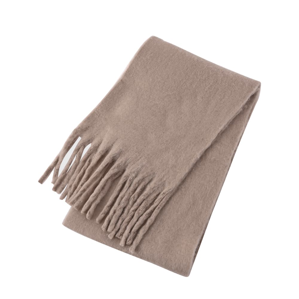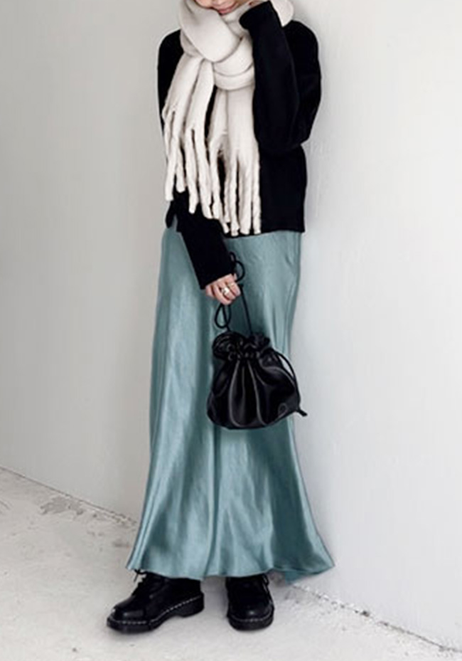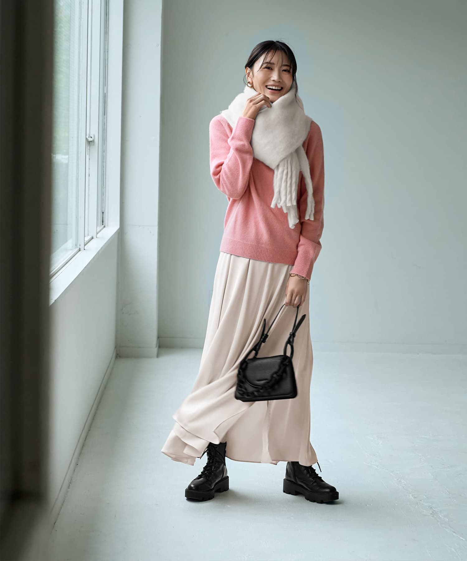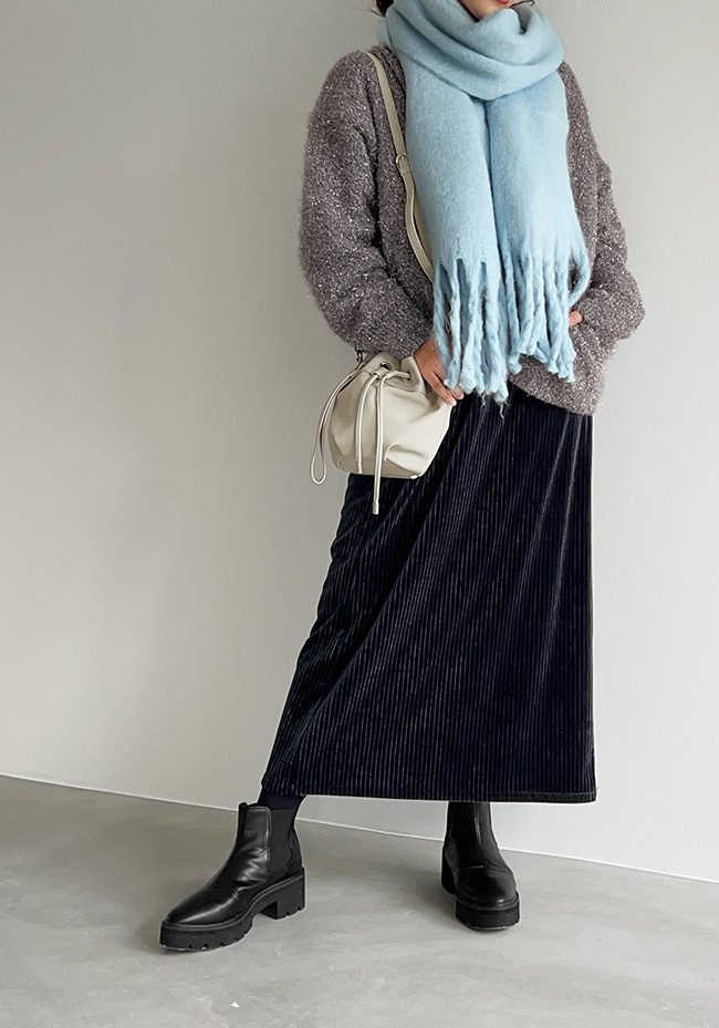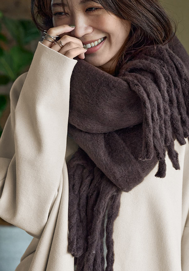 この素材感のマフラーは現在の巻き物の主流、という感じで、たくさんのブランドやショップから出ていますが、あまりにも安価なものだと質感がチープになり過ぎるので、1万円以上である必要はありませんが(そこはお好みです♪)、ある程度は出すのがお薦めです。肌触りはフワッとした感じで、チクチク感はなし。