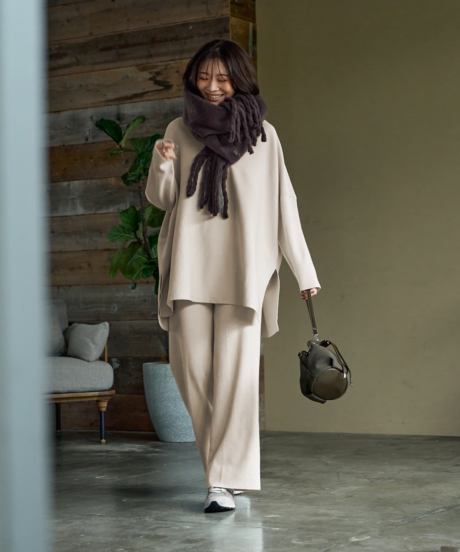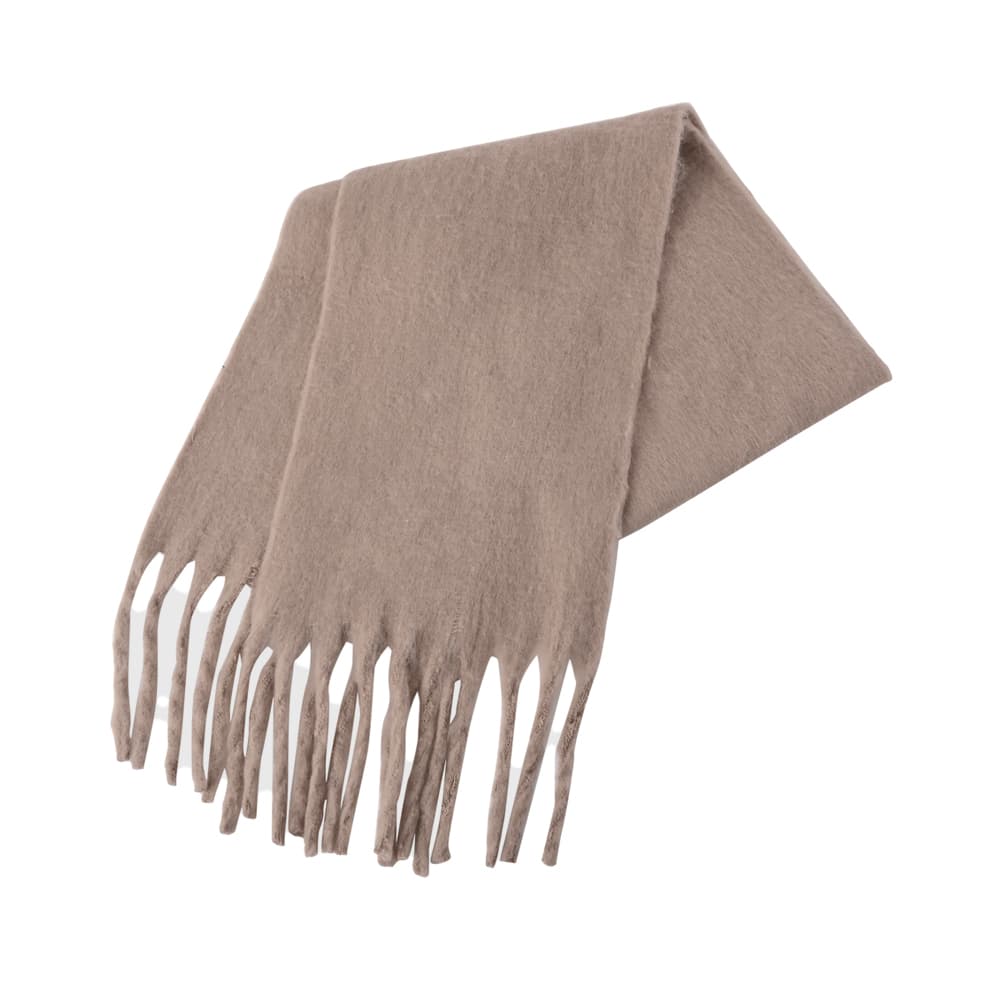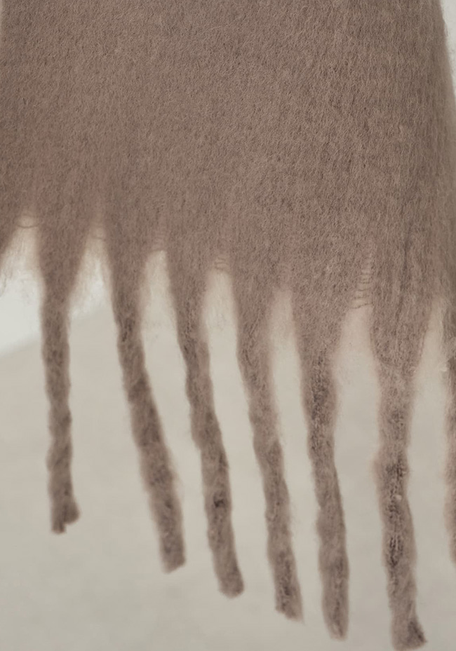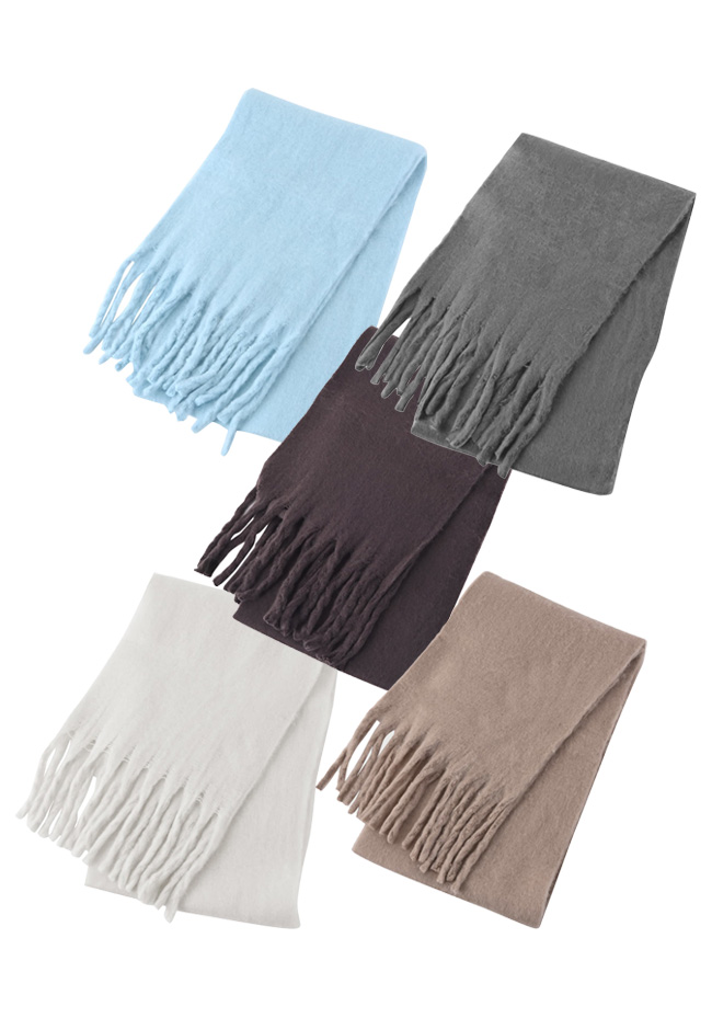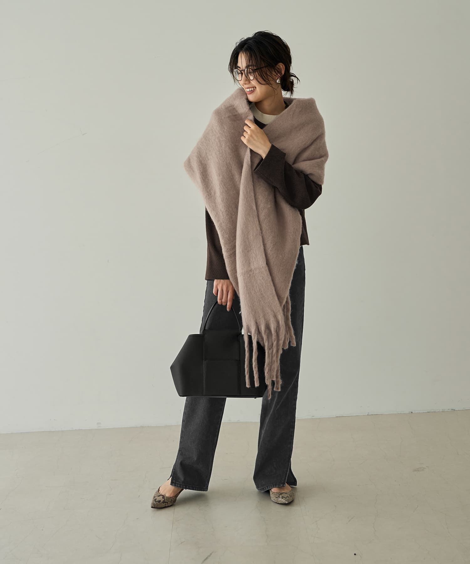 ニットをギュッと圧縮してから表面を掻いて毛を起こし、ボリューム感を出したロングマフラー。着けるとボリューム感があり、この量感が今っぽい感じのトレンド感あるデザインです。 モワッとしたふんわり質感が可愛く、端っこのフリンジが太いのも存在感があってオシャレ。色々と中途半端さの無いところがオシャレ見えする秘訣です。
