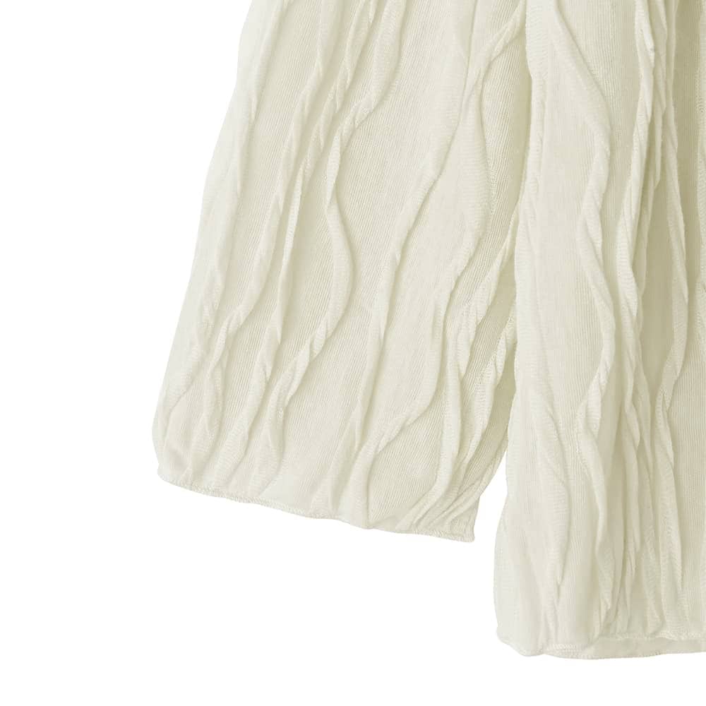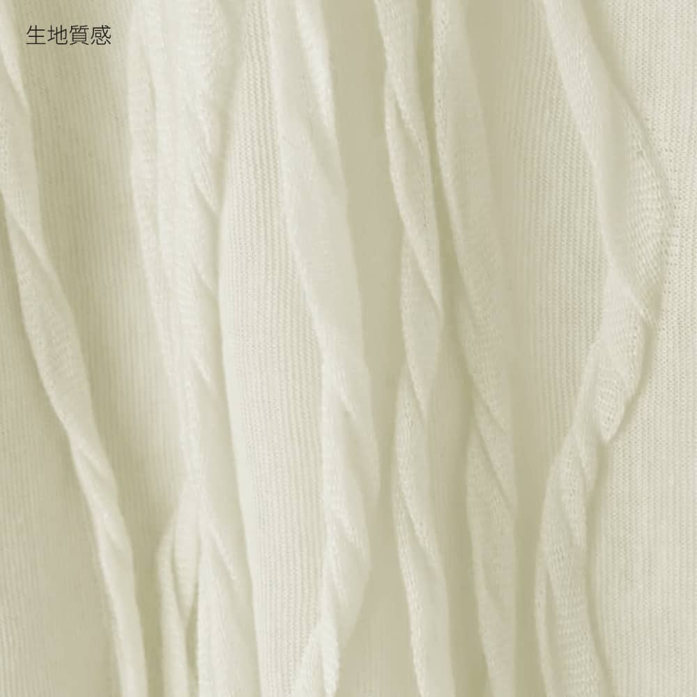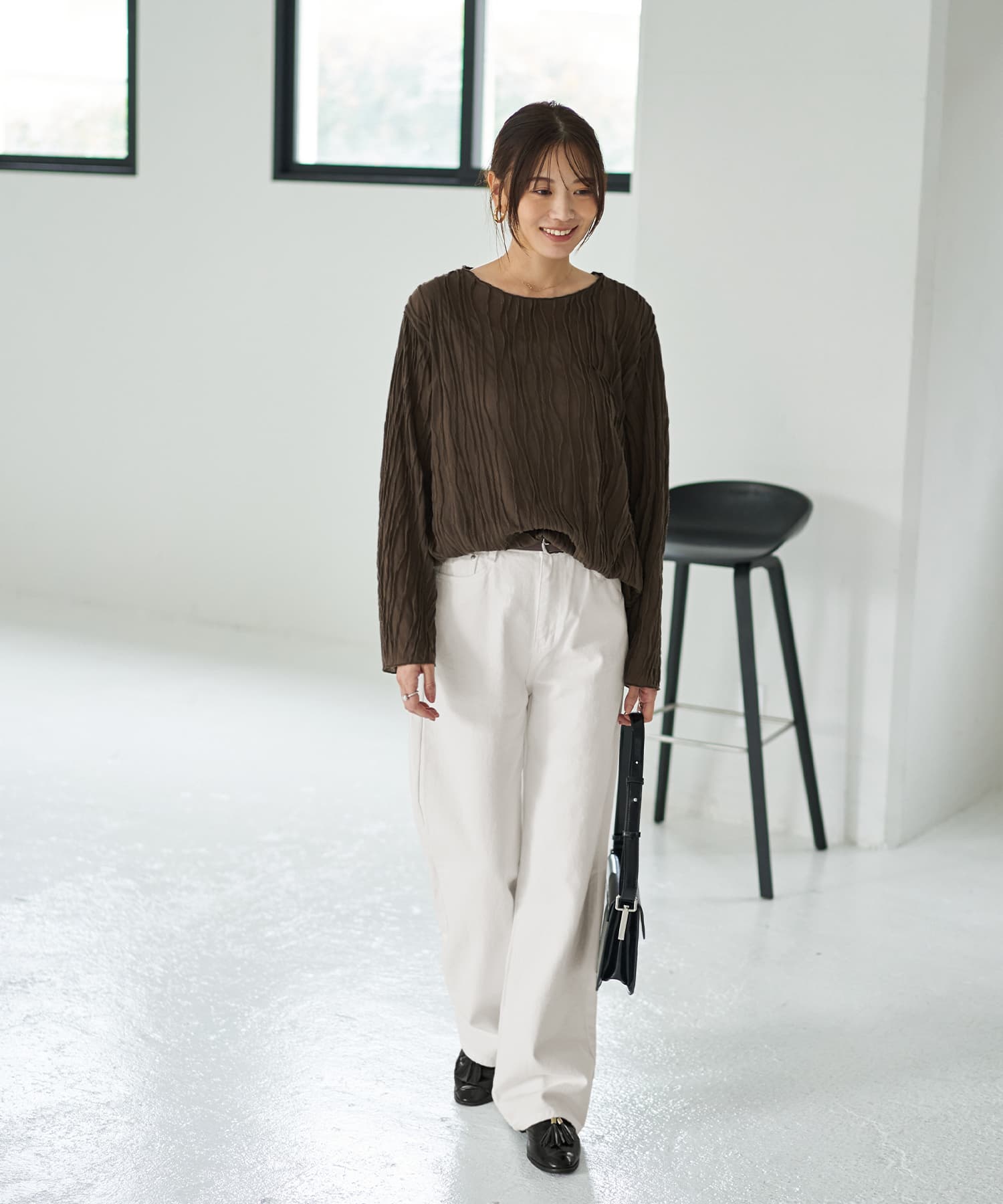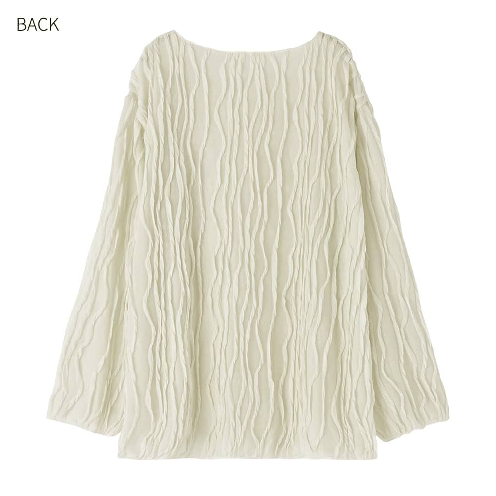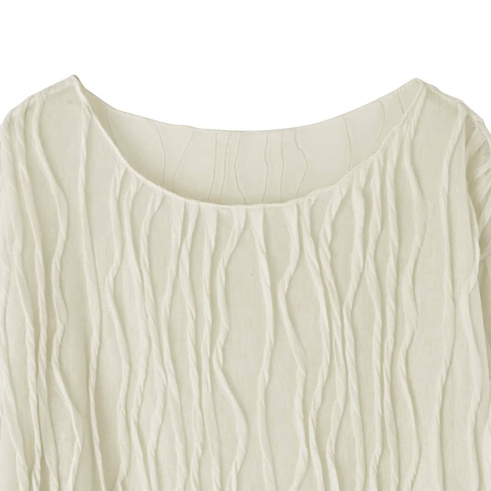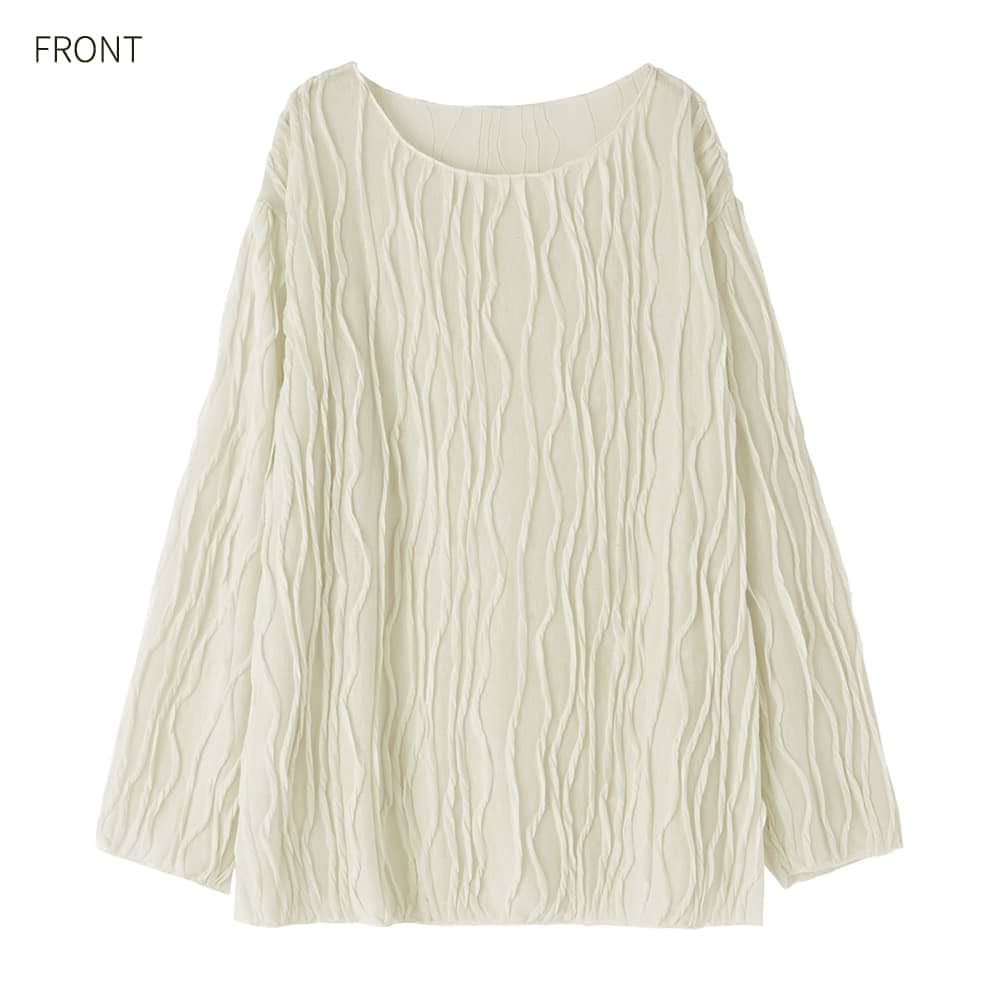 【お待たせいたしました!待望の再登場】優しいガーゼ質感が心地良く可愛いと大人気ブラウス並みの華を持つカットソートップス◆10/9インスタライブご紹介商品◆アーカイブのご視聴はこちらから→【10/9ライブ】【この商品の特徴】◆生地をつまんで柄状に立体感を出した、凝った印象の華があるデザイン◆ふんわりガーゼ質感のカットソー生地◆着る季節を問わない素材感◆暖かさはインナー&羽織りで調節が可能◆とても軽くラクな着心地◆体型を問わないゆったりとしたサイズ感◆さりげなく女性らしさのある雰囲気◆飽きたら部屋着にもできる肌触りの良さ◆シワにならずお手入れがラクちん◆即完売後、生産中止からの奇跡の復活【この商品の詳細】◆ウェーブをかけながら生地を縦方向につまんでストライプ状の模様を出した、とても凝った感じの立体的なデザイン。昨年も大好評をいただき完売しましたが、工場が閉業のため追加生産ができず→この度新たに作れる工場を見つけて、嬉しい再販となりました。◆ほんのりと透け感があるシアータイプのプルオーバー。インナーのデザインはさほど影響が無く、寒い時期はヒートテックなどの長袖インナーを合わせて着用します(暖かいときはタンクトップやキャミソールなど)。◆凝った着こなしをしなくても十分な存在感があり、シンプルなボトムスを合わせるだけでサマになるデザイン。急いでいるときも、これを着てデニムを穿けば即時に可愛いコーデが出来あがるようなトップスです。◆生地はガーゼ調のふんわりとした質感。カットソーの一種ですが珍しいタイプで、独特の風合いがラフで可愛いと人気です。優しく柔らかいガーゼの肌触りは、部屋着にしたくなるくらいラクで気持ちイイとのお声も。シワもできずお手入れも簡単です。◆身体に沿わないゆったりとしたフォルム。長袖カットソー同様、気楽に着れるトップスです。フォルムやディテールの動きが可愛いので、裾をアウトで着るのがお薦め。生地に厚みはなく、お好みで裾をインしても可愛く着用できます。◆首元は女性らしさのあるボートネック系。普通のボートネックよりはもう少し開いており、なだらかなカーブのネックライン。下着の肩紐が見えない程度の開き加減になっています。◆裾はストレートタイプのメロウ処理。波のようなフリフリ感が無いタイプのメロウです。生地自体の伸縮性はありますが、ウェーブ状のつまみ加工とメロウ処理により、それ以上は伸びないようになっています。ただしゆったりしているため動きづらさはなく、とくに問題はありません。◆カットソーならではのラクな着心地にブラウスのような華やかさが加わった、珍しさとオシャレさのある魅力的な一枚。ガーゼの柔らかさにほんのりとした透け感、ボートネックに優しい線を描くフォルム…という、女性らしい要素が幾重にも共存。そのため狙った感じはないのに、自然な色香が出る点も特徴です。【さらにプラス情報】◆暖かさ:これ自体は薄くてシアー感があるため暖かいお洋服ではありませんが、中にインナーを着込めるゆったり感と、上に何でも羽織れる生地の柔らかさがあるので調節がききます。◆インナー:ヒートテック的な防寒インナーのほか、とろみ薄リブタートル(※)などのハイネック系インナーとの重ね着を楽しむこともできます。※当店で大人気の秋冬コーデ用インナーカットソートップスです。寒くなければキャミソールなどもモチロンOKです。◆羽織りもの:生地が柔らかいため、とくにアイテムを限定せずにいろいろと羽織ることができます。◆ボトムス:パンツでもスカートでもOKです。バランスがとれないときは裾を部分的にインしたりすると、うまくまとまるかもしれません(のでやってみてください ♪)。◆袖のたくし上げ:リブなどはなくフワッと広い感じなので、そのままではたくし上げができません。少し折り返してからたくし上げるか、ヘアゴム等で固定をすれば可能です。◆シワ:基本的にできません。◆肌触り:柔らかくフワッとしていて、チクチク感はありません。◆毛羽立ち:とくにできやすい生地ではありませんが、その方の動作グセやバッグとの摩擦具合、着用頻度やお洗濯方法により個人差がありますので、できることもあるかもしれません。できた場合は毛玉取りクリーナー等でお手入れをしてください。◆静電気:とくに発生しやすい生地ではありませんが、その方の帯電体質具合や合わせアイテムなどに加え、冬場は乾燥でどうしても…というところはありますので、もしも気になる場合はエレガードなどの静電気防止スプレー等でご対処ください。◆昨年モデルからの変更点:とくに変更はしていませんが、工場が変わりましたので微妙な差異はあるかもしれません。見た目の印象に変化は無く、同じ感じでご着用いただけます。お色はアイボリーからクリームに変更があり、新色のカーキブラウンが追加されました。【その他の仕様などの情報