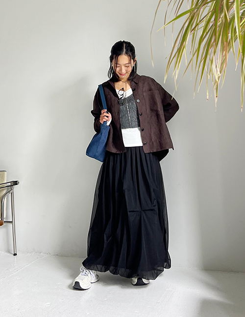 フロントジップでカッチリし過ぎないところが可愛いこちらのジャケット。Aライン×Aラインで合わせても好バランスです。ノーカラーはタートルネックやハイネックとものすごく相性が良いため、ついつい組み合わせてしまいます♪テラコッタは程よく華やかな『優しい差し色』になって、どなたにも取り入れやすくて素敵だと思います。