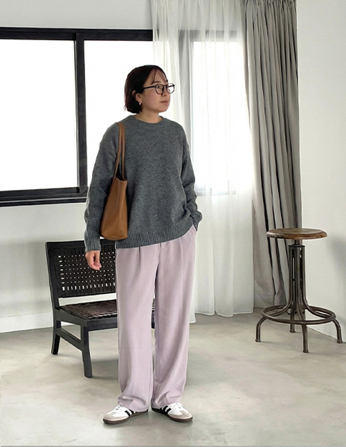 お色はダークトーンでまとめ、あまり重たく見えないようボトムスはスリットニットパンツ、足元はサンダルを合わせてみました。