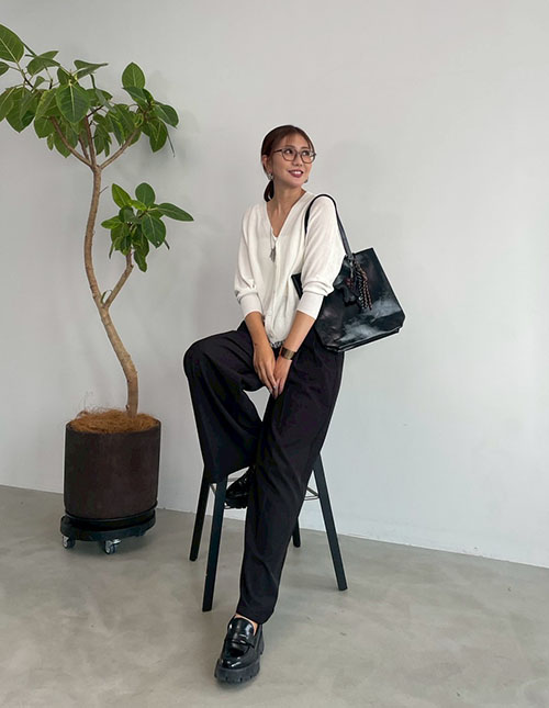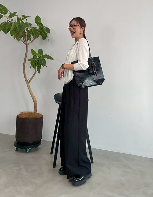 かっこよく着映えするワイドシルエットが特徴のパンツと 糸の揺れ感が上品なショート丈カーディガン合わせ。