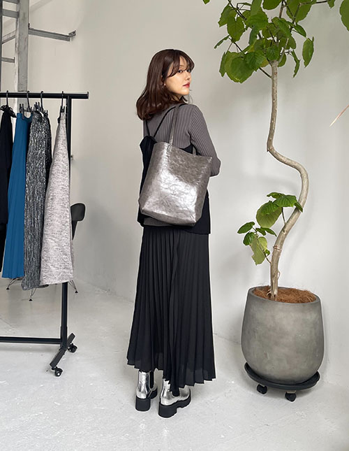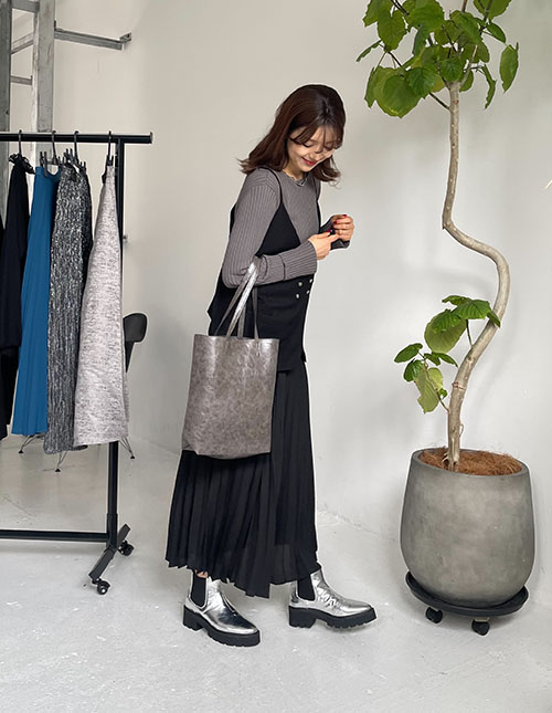 グレー×ブラックコーデ。 このまだと少し物足りない気がして足元にシルバーのブーツを合わせてみました♩ 良いアクセントになるのでシルバーブーツ大好きです!! プリーツスカートはたまたま01しかなく履いてみましたが、 私の身長ですとサイドゴアブーツを履いて少し肌見えするくらいの丈感で、 これはこれでありかも!!と思いコーデしてみました♩もちろん02でも良いバランスになると思います♡
