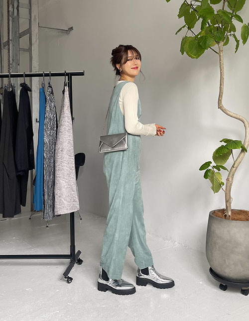 なかなか見ないミントグリーンの色味が可愛すぎるスエードタッチサロペット♡ 柔らかくて楽ちんノンストレスな着心地です◎ホワイトと合わせたら甘くなっちゃうのかなぁ?と思いきや 大人カジュアルな雰囲気になり、個人のインスタのストーリーに上げた際も大好評でした♡ 小物や靴をシルバーで統一した事でまとまりも出つつ、良いアクセントになったかなぁと思います♩