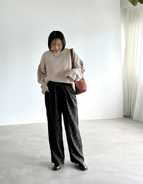 スカートにもパンツにも合わせれて、スウェット感覚で気楽に使えるおすすめアイテム。