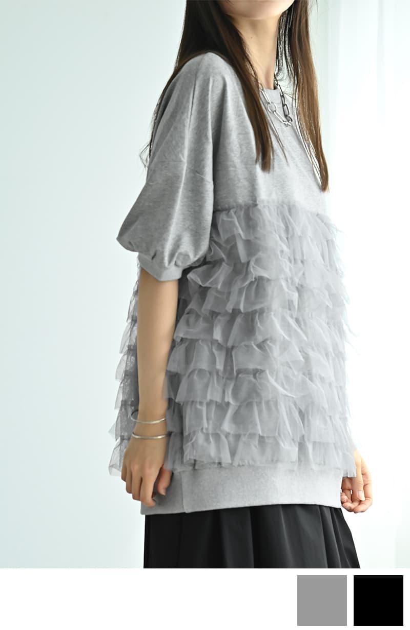シンプルだけど華やか。ブラックのチュールがアクセントになり、 グレーのスカートと合わせればバランス良く大人のモノトーンコーデに。