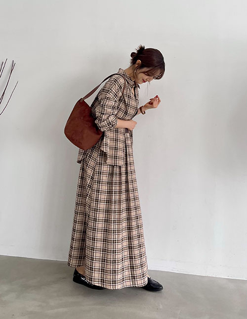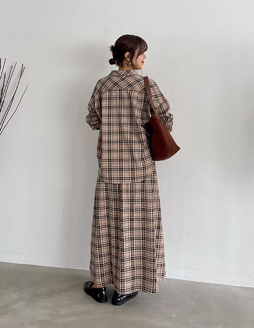 秋に着たいチェック柄のセットアップ♡ 今回はシャツのボタンを全て開け羽織として着てみました♩ 足元もローファーにし、手首、足首、首元を見せる事で 抜け感を出してみました◎スエード調バケツトートバッグのブラウンと こちらのチェックのお色も相性ばっちりですね♡