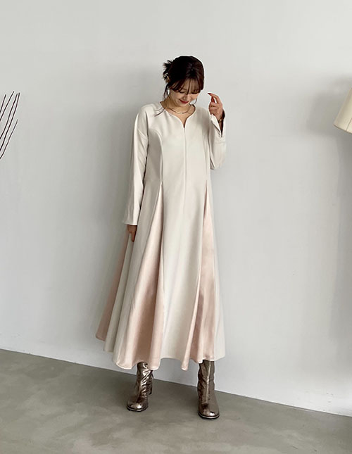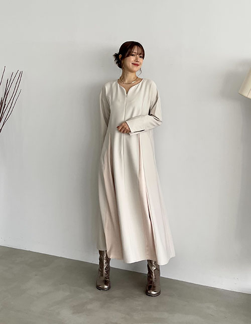 着るたびにテンションの上がるフロントファスナー微配色ワンピース♡ 配色になっているのとデザインも相まって明るいお色でも のぺっとせずに立体感が出るワンピースです♩ ハートシェイプ風ラインのVネックのネックラインは、 柔らかい印象もありつつ首元がスッキリと見えるところが お気に入りです♡新作のチャンキーブーツのメタリックと合わせてみました♩