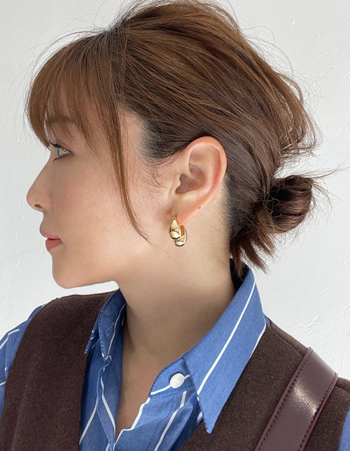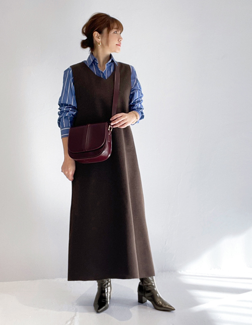 今年の気分にピッタリなダークブラウンのジャンパースカート。パッキリとした明るいブルーのシャツを入れて、色のコントラストを出してみました。後ろのキャッチにも飾りが付いたピアスはお気に入りの一つ。前後でツヤッとしてカワイイ♪ ワインブラウン色のバッグは『ノーブルショルダーバッグ』、ネイビーのニットガウンは『デザインポケットロングカーディガンC』で過去商品です。