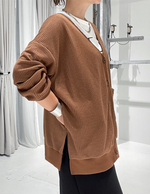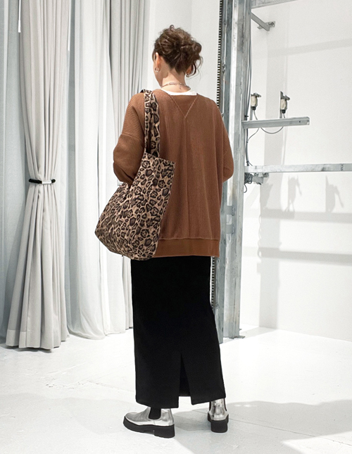 スタイリッシュな黒のペンシルスカートを、カットソー生地のカーディガンでラフにカジュアルダウンしたコーデ。ブラウンはブラウンでもテラコッタ味を帯びた明るいブラウンなら、十分に差し色になりますね♪