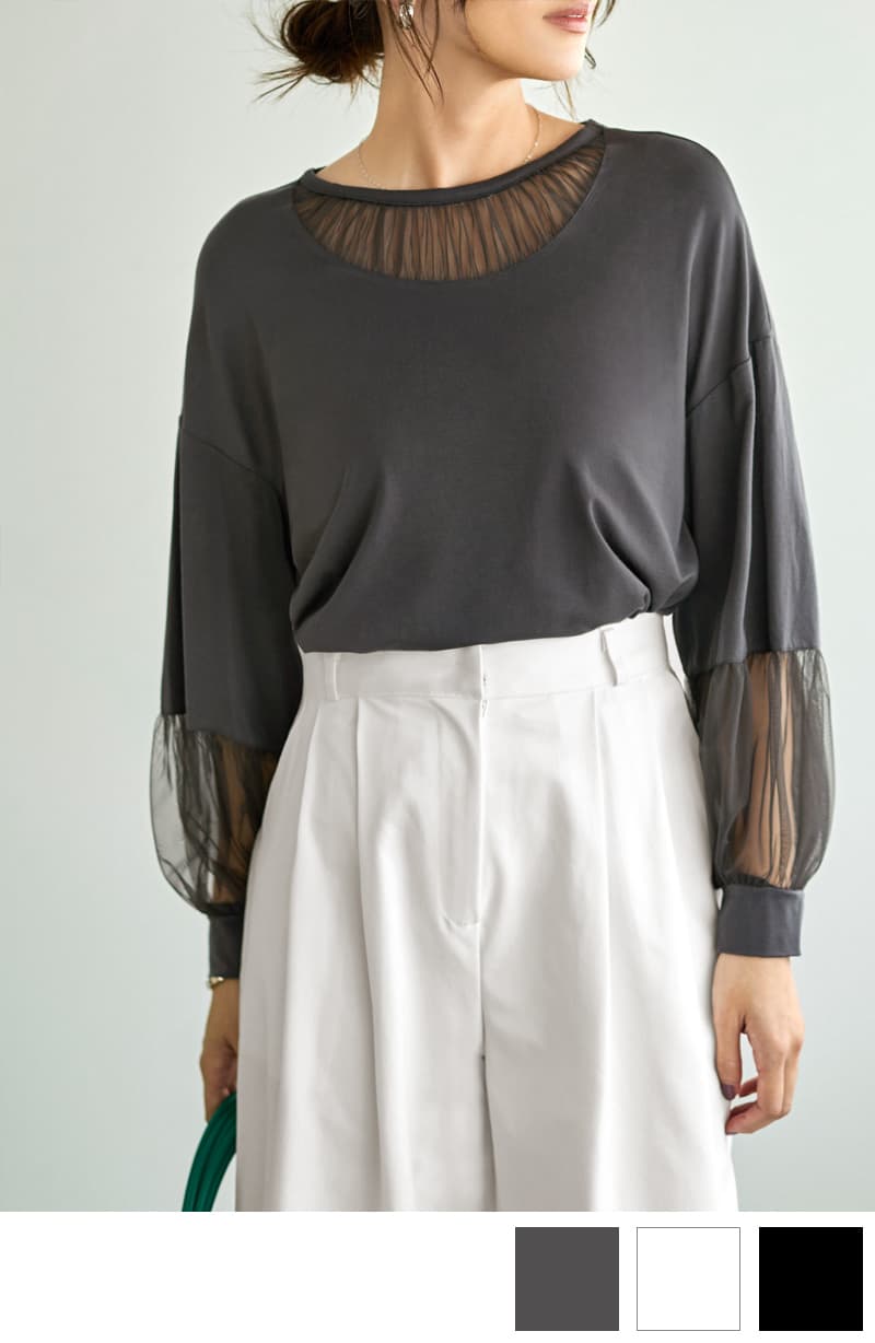 【Made in JAPAN】部分チュールのとろけるカットソートップス