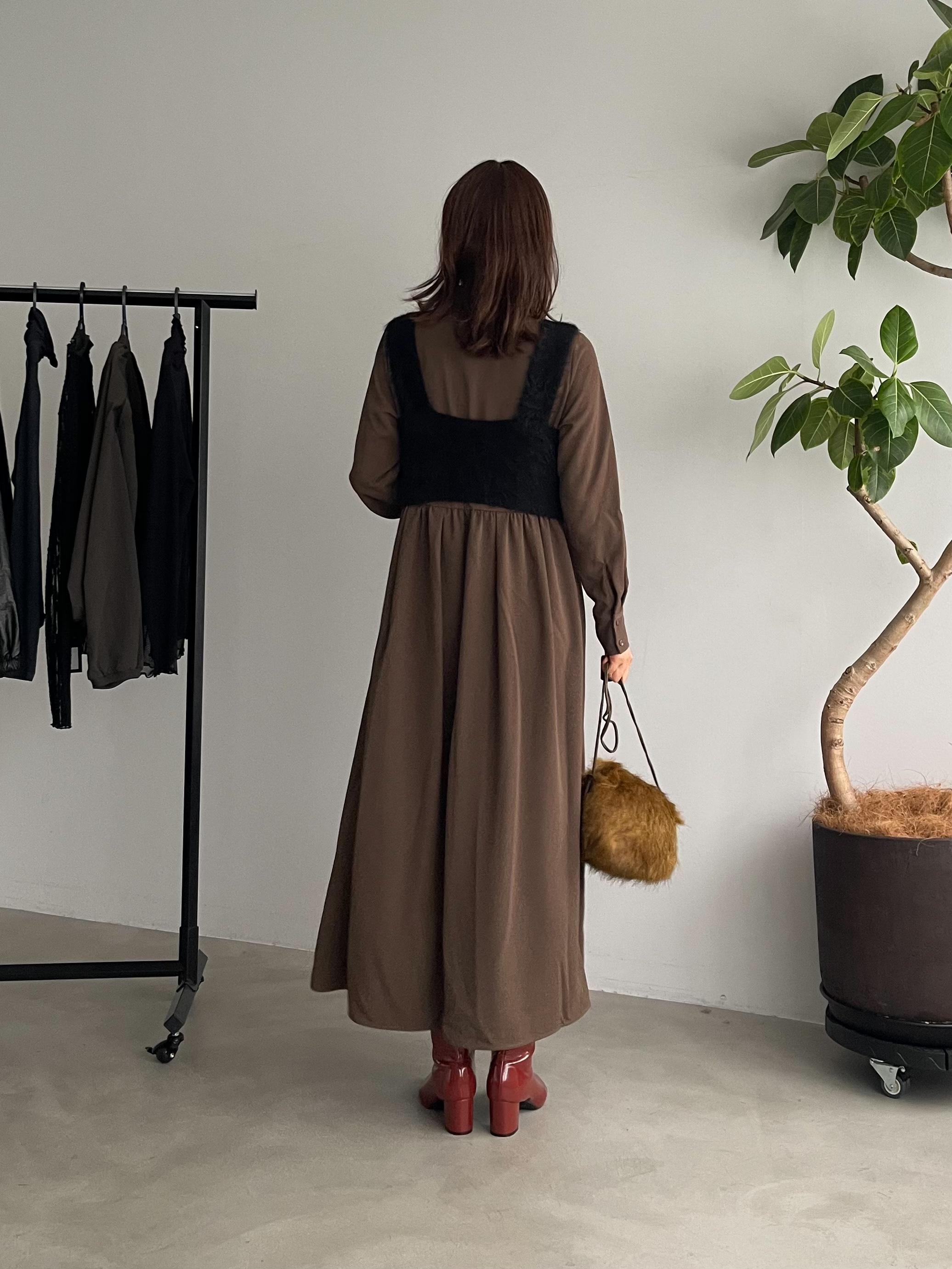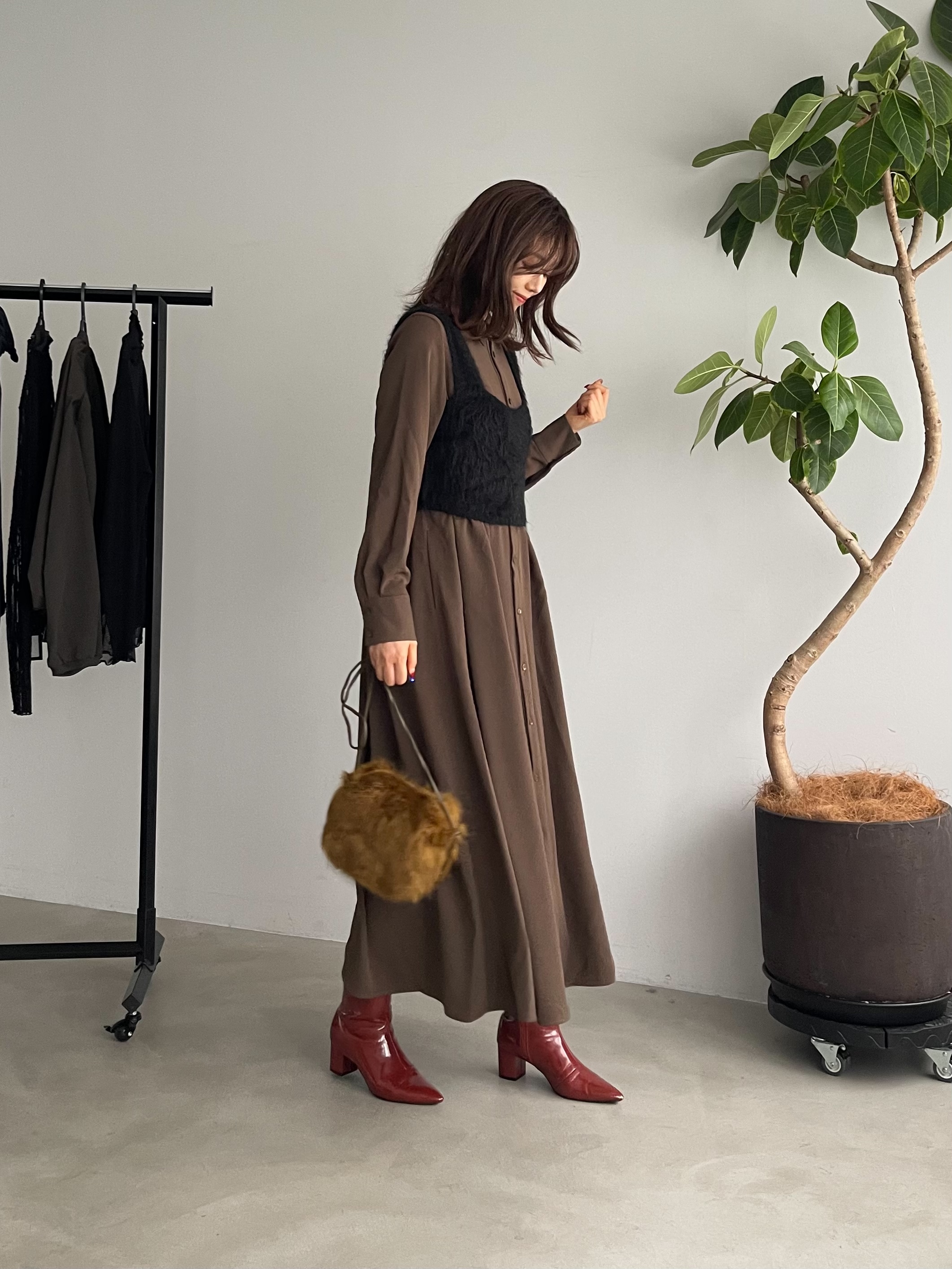 今季大人気カラーのブラウンのワンピースを使用したコーデ♩ ふわふわのビスチェを重ねてより季節感を出してみました◎ 襟元は今回ボタンを上まで閉めてますが開けたバランスでも抜け感が出ておすすめです♩