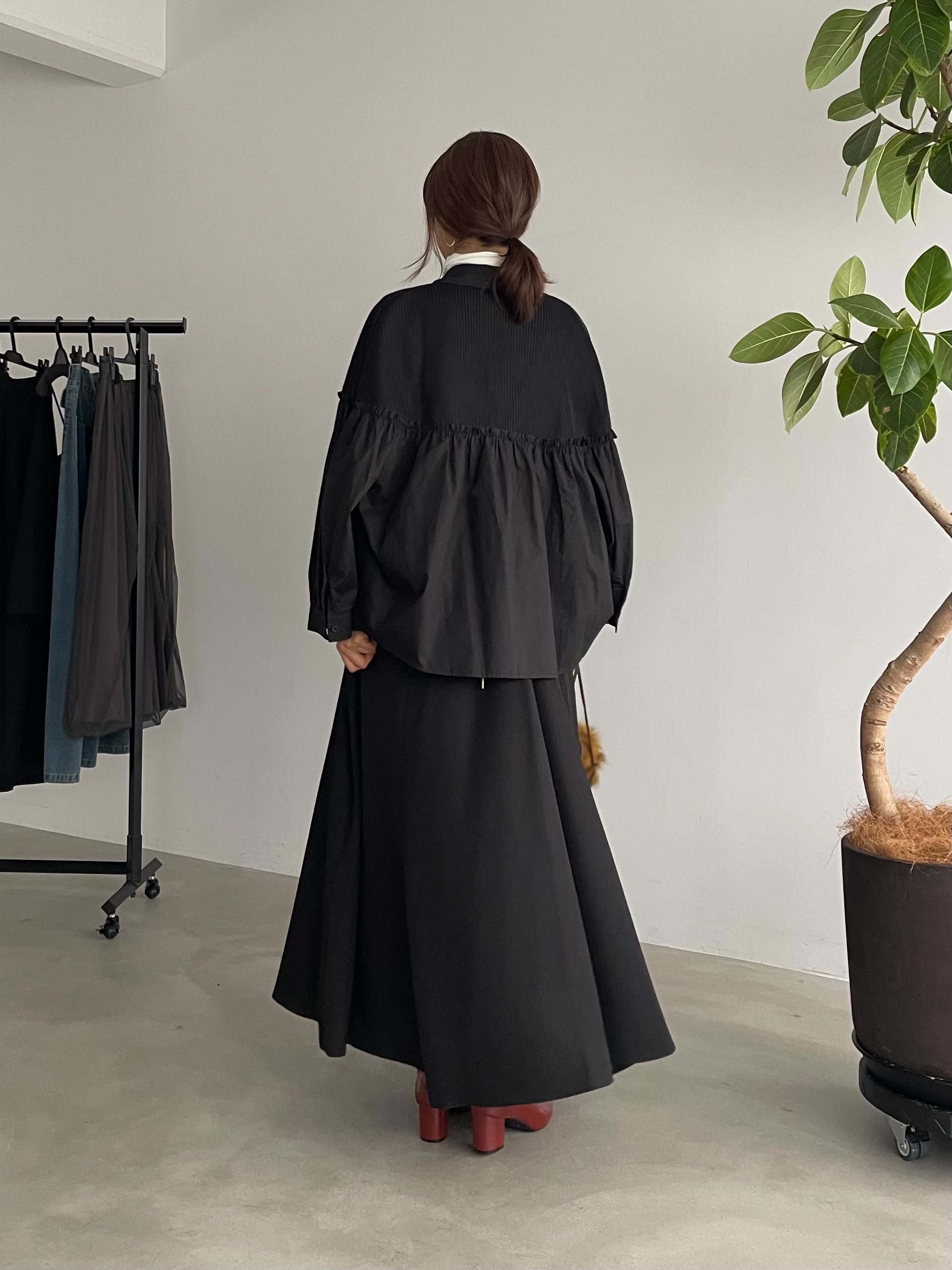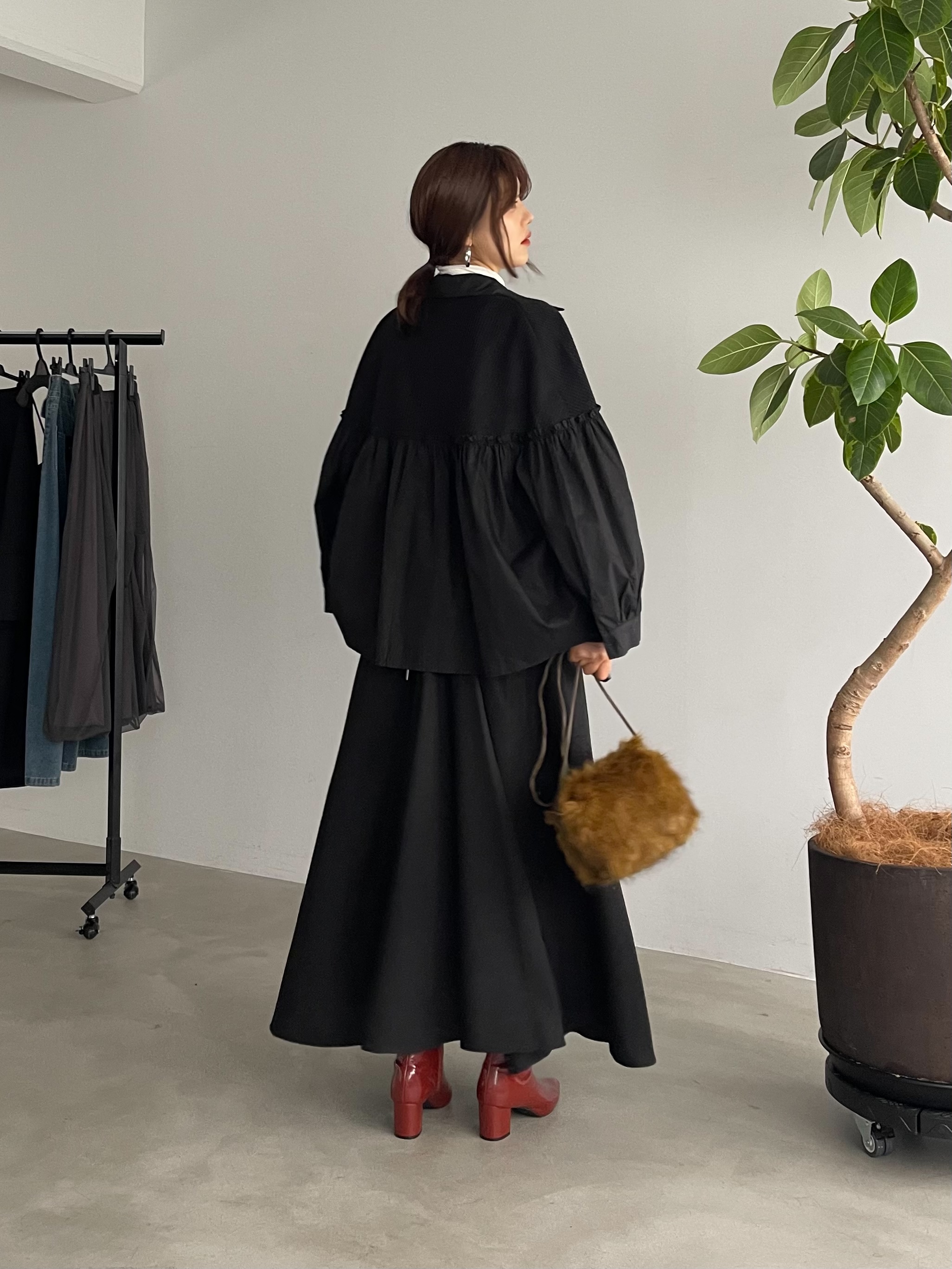 ゆったりとしつつもすっきり見えするフレアジャンパースカートに BLKのドッキングシャツを肩掛けしてみました♡ インナーにはとろみ薄リブのホワイトを合わせモノトーンにしています◎ 足元には私もリアバイしたグロッシーミドルブーツのブリックを合わせアクセントにしてます♩