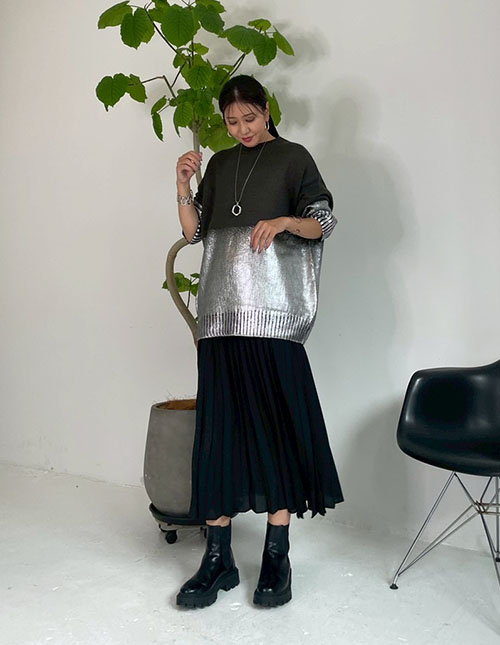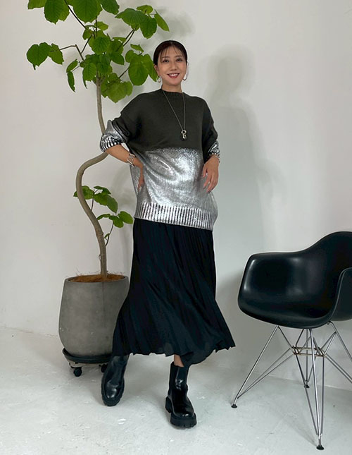 大人の落ち着きとクールさを兼ね備えた万能カラーのチャコールに プリーツスカートで大人らしさを出しました