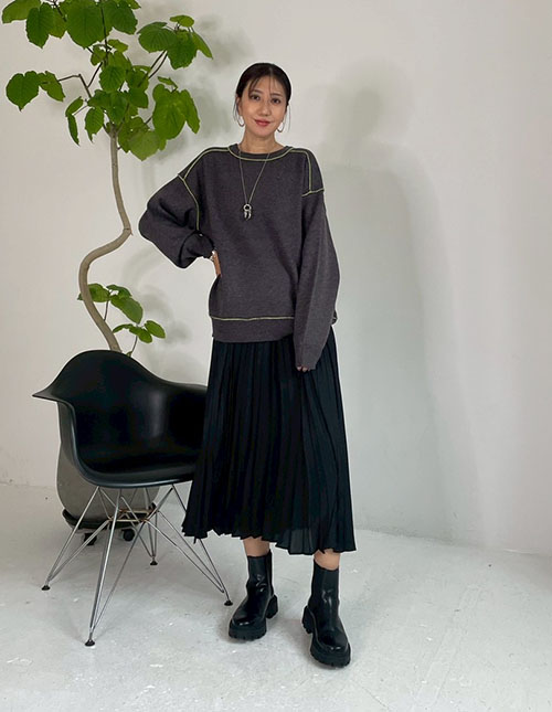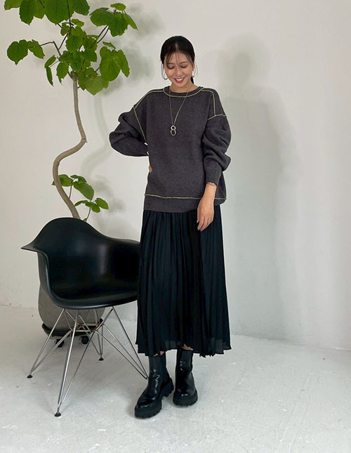 シンプルながらも一枚でスタイルが決まる、抜け感たっぷりのトップスに プリーツスカート合わせで女性らしさを演出