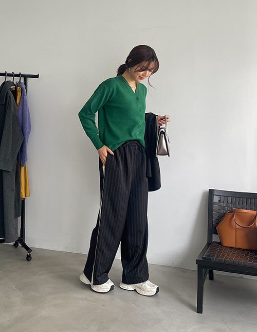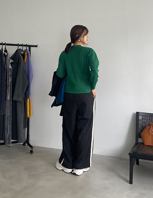 リアバイしたしっとりもっちりカーディガンのグリーンに BLKの新作ピンストライプ配色ストレートパンツを合わせてみました♡ 「縦のピンストライプにサテン調の配色ラインを添えた、モードな印象のストレートパンツ」なるほど だからスニーカーを合わせても、スポーティになり過ぎたり子供っぽくならない 大人のストライプパンツなんですね◎と改めて写真を見返してます♡笑 きれいめからカジュアルものとも相性良さそうで幅広いコーデに着用できそうです♡