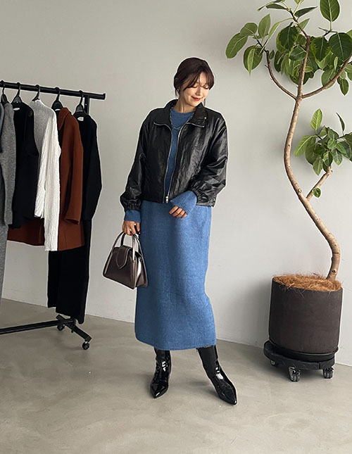 ブルー×ブラックコーデ◎こちらのアウターは最近じわじわ気になってきているフェイクレザーブルゾン!!♡