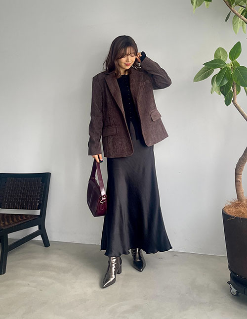 ダークトーンで落ち着きのある秋コーデ◎ 今年ブラウンが大流行でしたが、個人的にもブラウンものに惹かれていて 撮影でもよくこちらのジャケットのブラウンを着用していたのですが、 やはりベルベット調のこの質感が季節感もありお洒落ですよね♩