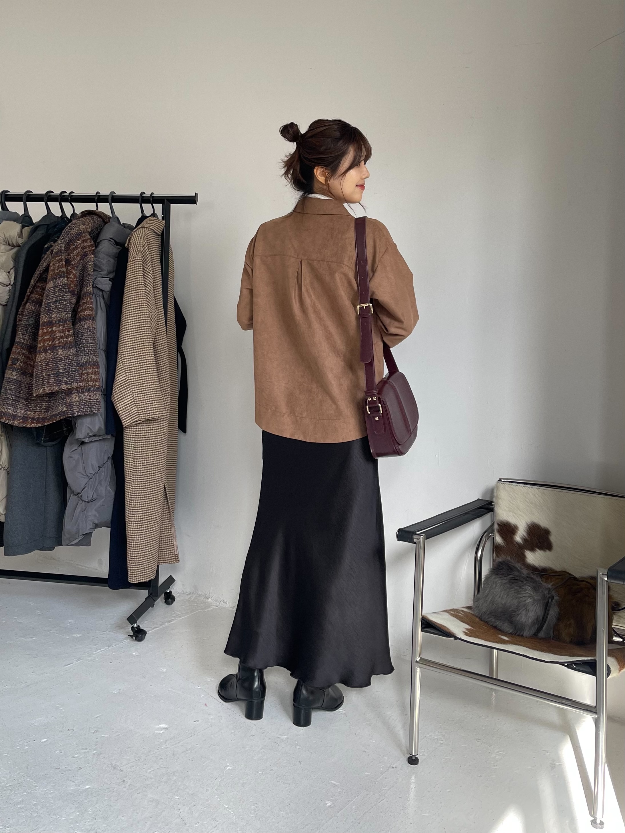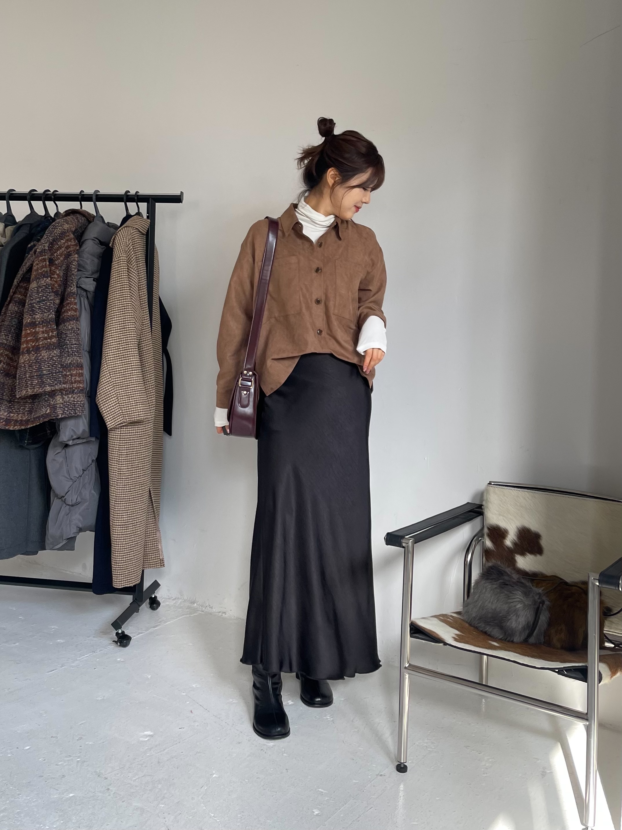 トップスとしても、羽織りもののアウターとしてもいけちゃう着回し力の高いライトスエードシャツ型ジャケットに、 とろみ薄リブをインナーに仕込んだコーデ◎首元や袖から見えるインナーがアクセントになってます♩ シャツ型ジャケットは、フェイクスエード生地で季節感も出るのに薄くて軽く温かいという便利アイテムです◎ シワにもなりずらいのが嬉しいです♡