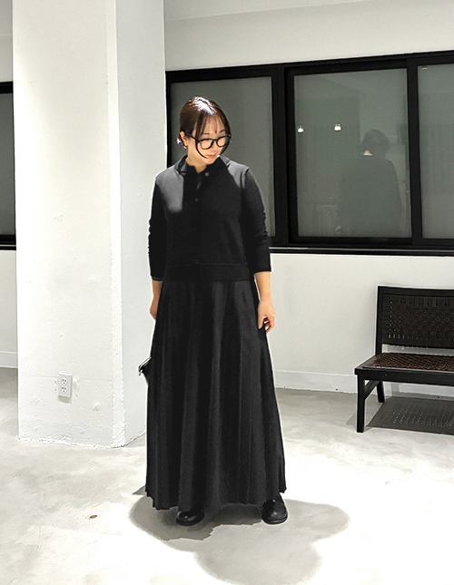 1枚でワントーンコーデが完成する楽ちんワンピ! 個人的にはスカートの生地感がとても好み。 156cmで靴を脱ぐいで真っ直ぐ立って、足の甲に裾が付く着丈になります。