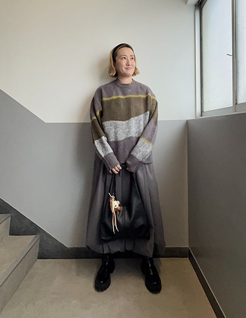 素材のコントラストが効いた、冬らしいレイヤード。 ジャケットの中に色を仕込むだけで、“定番グレー” が一気に都会的に。