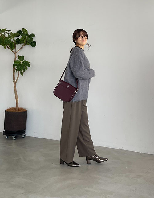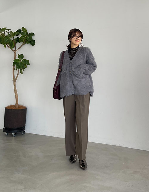 ふわふわ感がたまらないニットカーディガン♡ ロングシーズン大活躍な中厚地2ダックパンツに合わせたシンプルコーデ◎ グレーのシンプルなカーディガンなので特別甘さがあるわけではないですが、 甘く見えるのが苦手な方はシンプルにパンツコーデがおすすめです◎