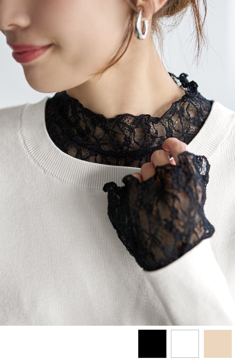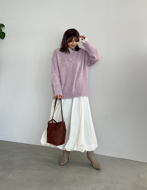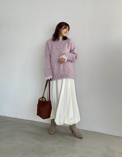 ふわふわニットのプルオーバータイプ♡ 個人的に秋冬のお洒落が楽しくなる要因のひとつが こういったふわふわニットを着れるからなんですよね…!!♡ 袖元と首元からレーストップスを覗かせてみました◎