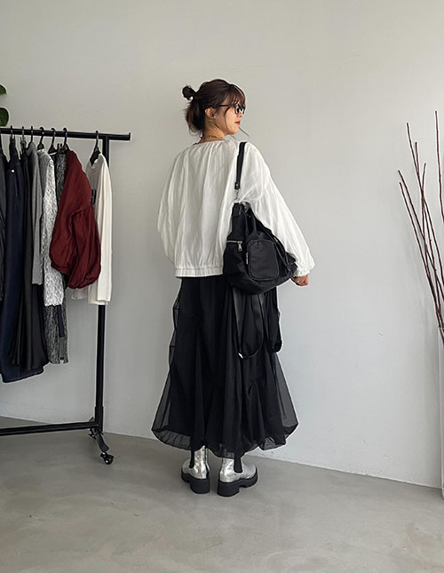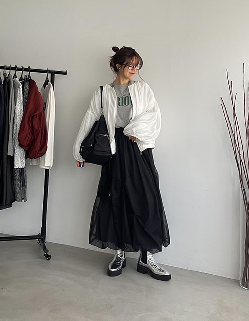 カジュアルにロゴT合わせ♩チュールスカートは綺麗めにもカジュアルにも合わせやすいです◎ 楊柳ブラウスブルゾンはロングシーズン着用できそうな生地で一枚持っておくと便利そうです♡ 特にアイボリーはクリアな発色のホワイトで秋冬にホワイトカラーを取り入れたい時に活躍しそうです♩