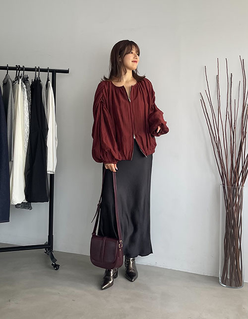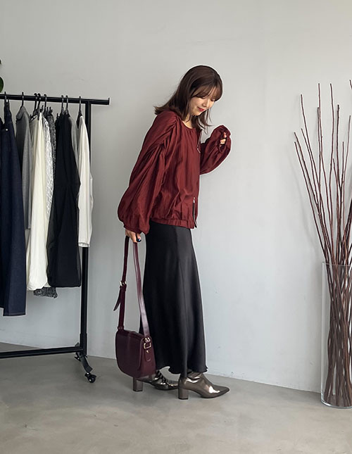 楊柳ブラウスブルゾンのバーガンディにマーメイドサテンのロングスカートを合わせてみました♩ ブラウスブルゾンはゆったりとしたデザインなのでタイトめなスカートとも相性ばっちりです◎