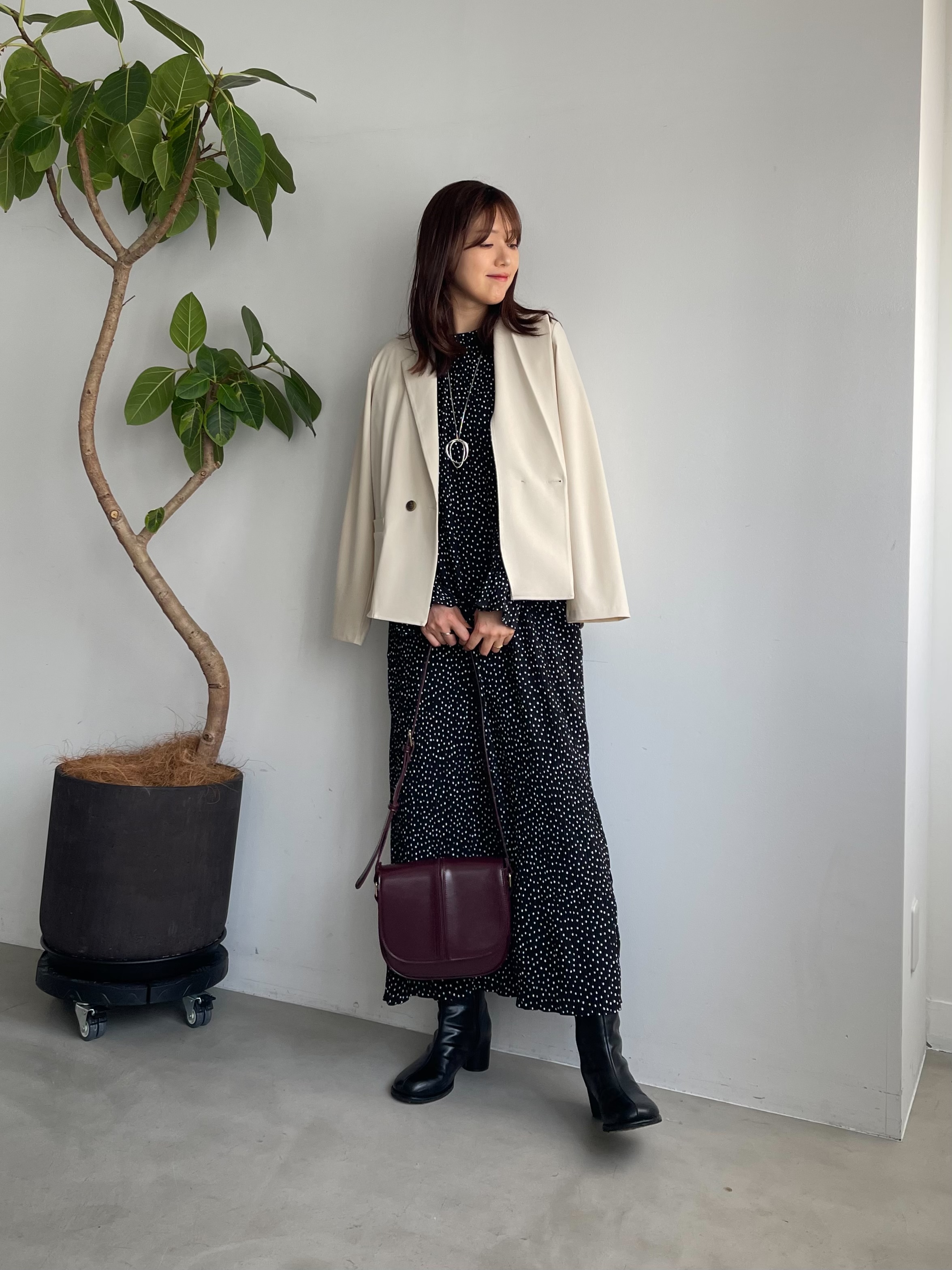 ドット柄パンツで抜け感を出しつつ、小物はシンプルにまとめたバランスコーデ。