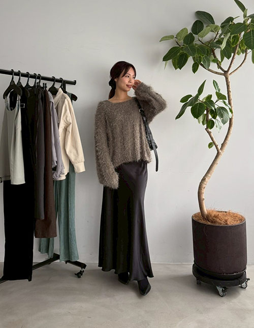 ◆ストライプ編みデコルテ開きシャギーニット