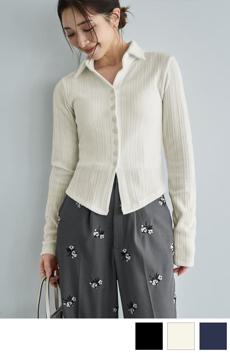 リブニットソー襟付きトップス