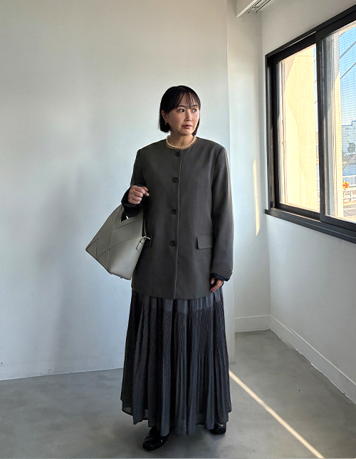 バッグはデリではお取り扱いの珍しいグレーが新鮮!シックなのに明るさを足せる便利な色だなと思いました。