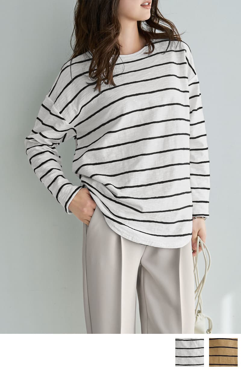 ハイウエスト気味で穿けるスカート&バッグもかっちりめを合わせて、ほっこりしちゃいそうなベージュボーダーをカジュアルダウンしすぎないように。