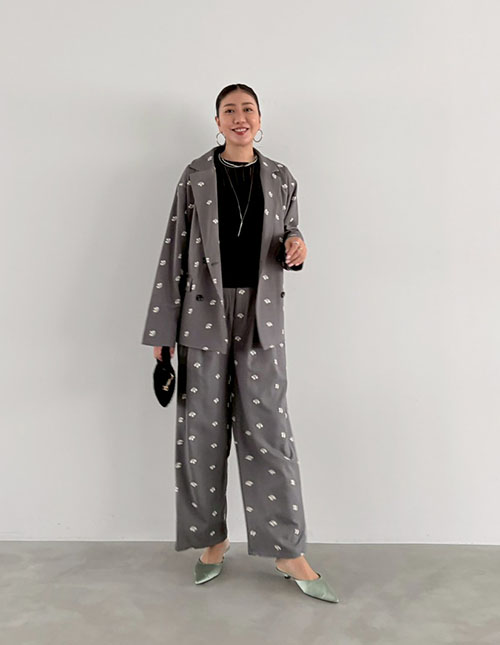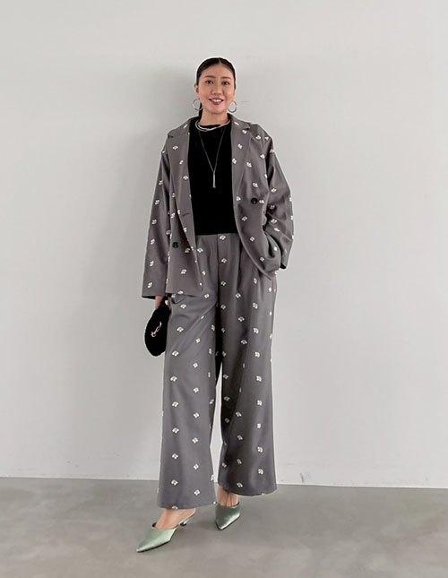 [SET]【BLK001】花柄刺繍ツイルテーラードジャケット×タックパンツ