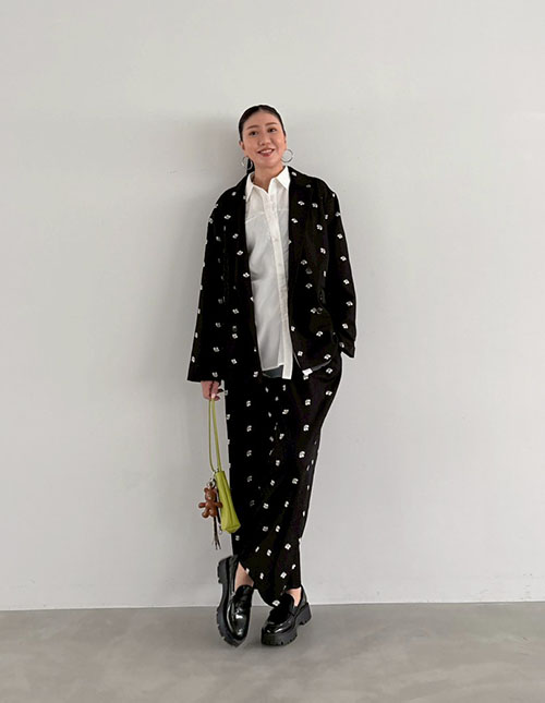 [SET]【BLK001】花柄刺繍ツイルテーラードジャケット×タックパンツ