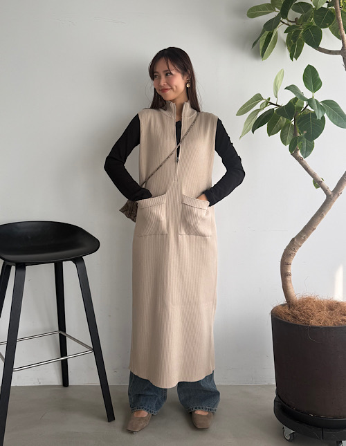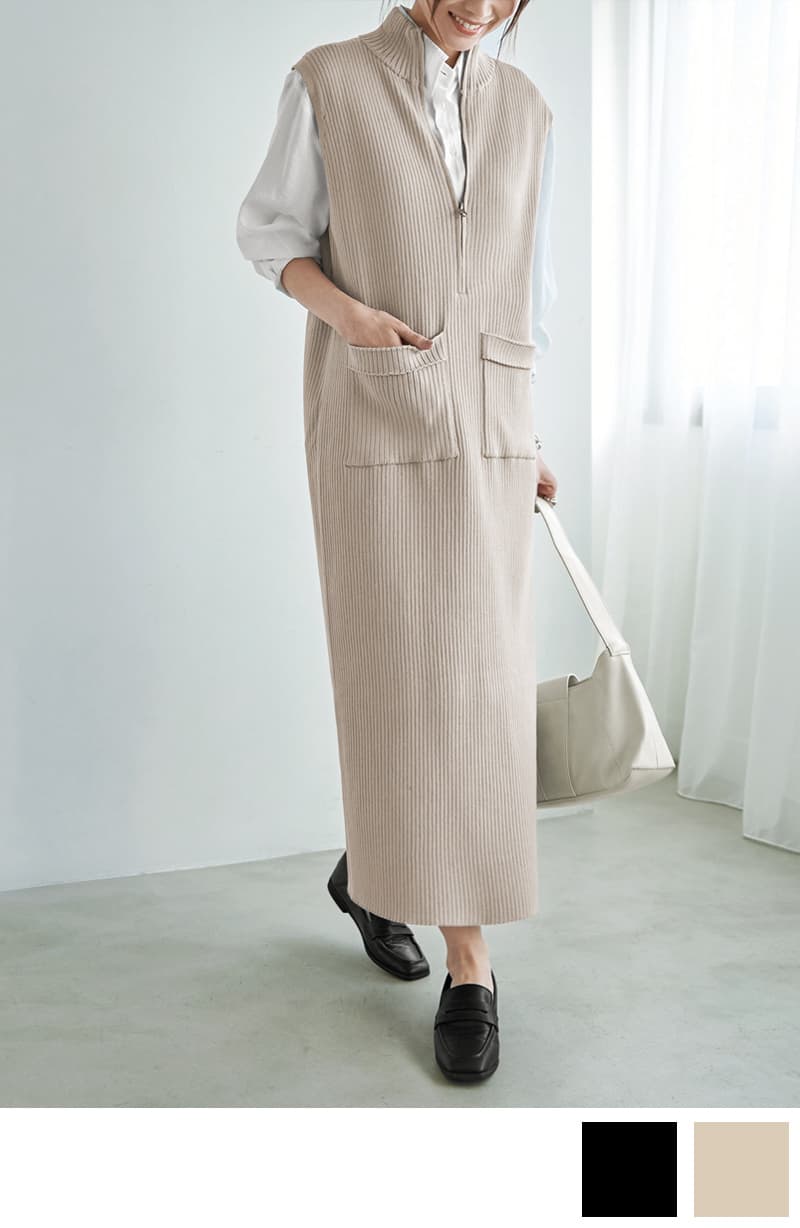 ジップ付きスタンドネックのリブニットワンピース