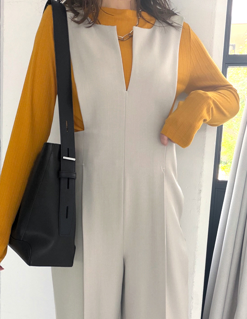 サロペットのインナーは白や黒などの定番色も素敵ですが、合わせやすいグレージュ系カラーの特色を活かして、カラー物を合わせるのも楽しい。山吹色のカットソーはイエローほど派手にならず、大人の味変カラーにお薦めです。