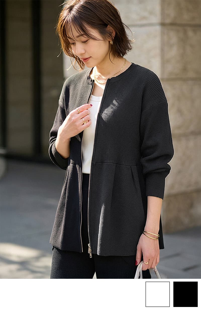 午前中の打ち合わせを終えて、午後はカフェでリモートワーク。ネイビーのリブニット襟付きトップスが知的な印象をキープしつつ、ホワイトのLUXEペプラムトップスを羽織れば気温調整もスマートに。アイボリーのワイドパンツが全体を軽やかにまとめて、「仕事モードなのにリラックスして見える」最強の3ピース。オンもオフも自分らしく——欲張りな一日のための処方箋。