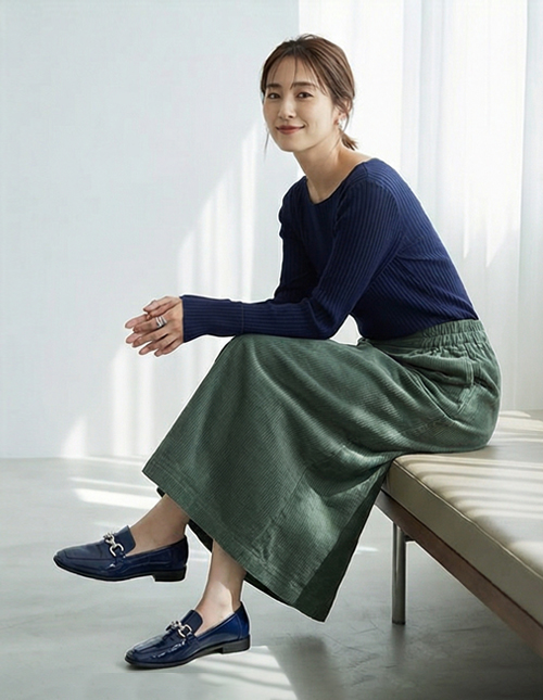 鎌倉の小町通りを抜けて、海沿いのカフェへ。ネイビーのボートネックリブトップスが顔周りをキリッと引き締め、ジェイドカラーのコーデュロイスカートが季節感たっぷり。ネイビーのチェーンローファーがコーデ全体に統一感を持たせて、カジュアルなのにどこか知的な印象に。セットアップ対応のスカートだから、トップスを変えれば何通りもの着こなしが楽しめる。