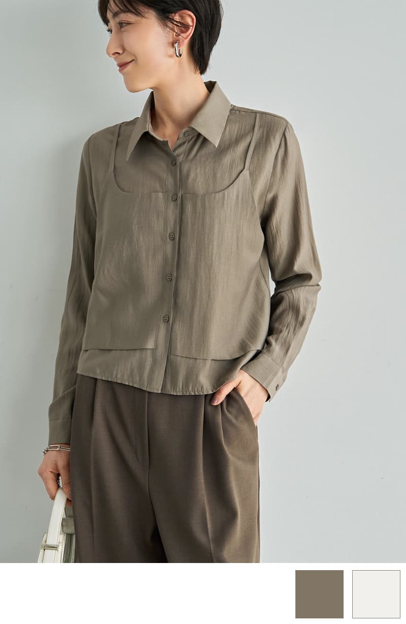品川のモダンなオフィスビルから、そのままディナーへ。ホワイトのキャミレイヤード風シアーシャツは、透け感がほんのり色気を醸しつつ品格はキープ。チャコールのラップスカートが腰回りをすっきり見せて、歩くたびにスリットから脚がチラリ。たった2アイテムなのに、「今日の私、完璧」と鏡の前で思わずガッツポーズしたくなる——そんなきれいめスタイル。