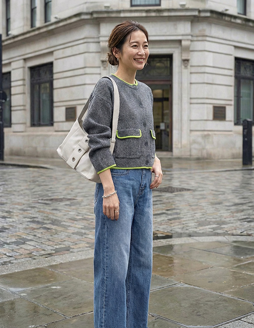 吉祥寺のセレクトショップを巡った後は、井の頭公園でのんびり。チャコールの配色カーディガンにブリーチデニムのライトブルーが爽快なコントラストを描く。アイボリーのハトメベルトショルダーバッグがアクセントになって、カジュアルなのに小物で格上げされた印象に。春の週末、どこへ行くにも連れていきたい——そんな頼れる3ピース。