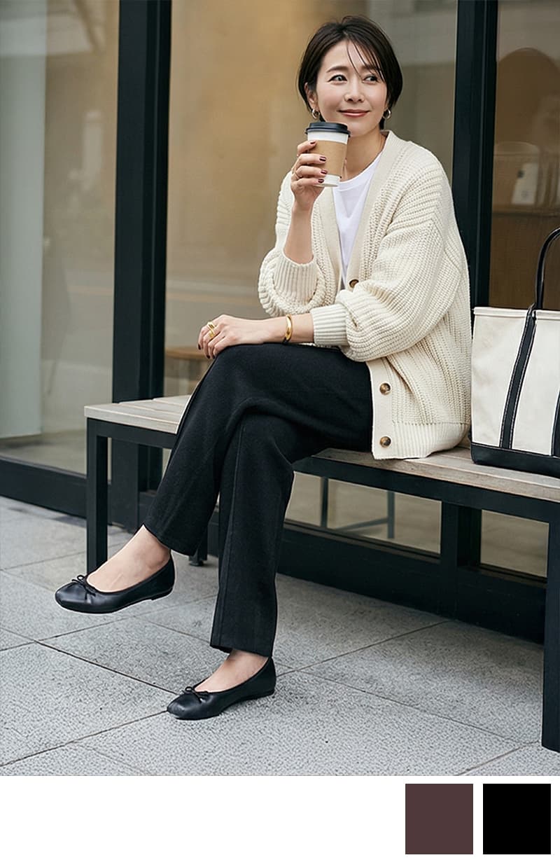 日曜の朝、駒沢公園でコーヒー片手に散歩する——そんなリラックスした一日にぴったり。ブラックのボリュームダウントップスは、スウェットなのにどこか洗練された表情。ダークブラウンのなめらかニットワイドパンツが脚を優しく包み、歩くたびに美しいドレープが揺れる。サングラスケースをネックストラップで下げるさりげなさが、「この人、休日もおしゃれだな」と思わせる秘密のアクセント。