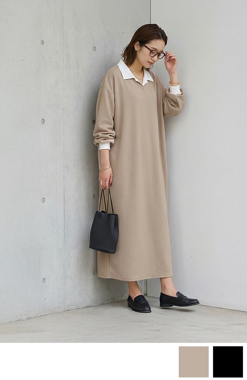 ホテルラウンジでのアフタヌーンティー、そんなシーンにぴったりのワンピース。ベージュのシボ入りカットソー素材が、光の角度で表情を変える上品な陰影を生む。襟付きだからきちんと感は申し分なく、一枚でサマになる潔さが大人のワードローブにふさわしい。ブラックの編み込みリアルレザーバケットバッグは、手にするだけで格が上がる存在。2アイテムなのに完璧——引き算の美学を知る女性のためのスタイリング。