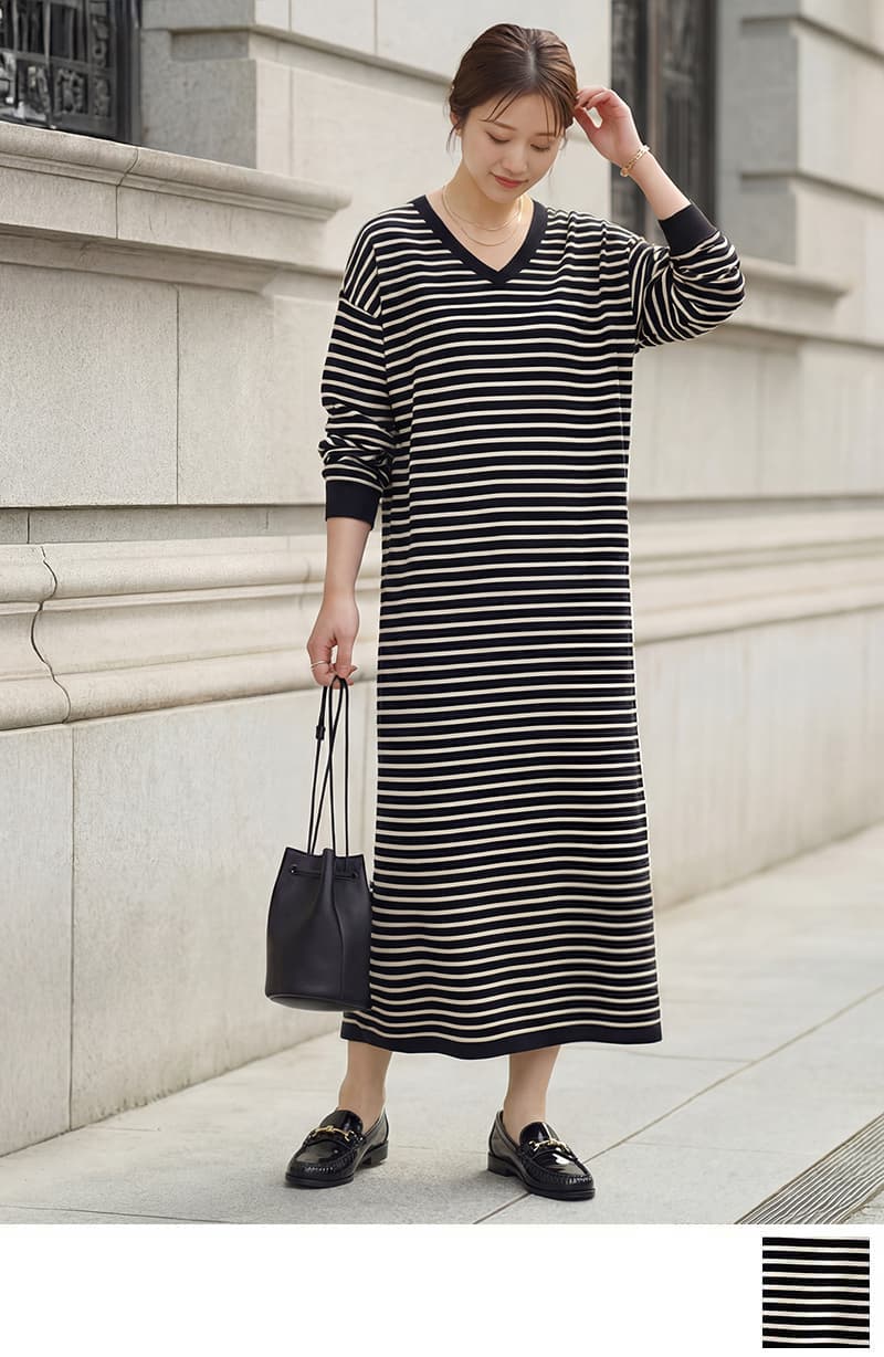 日曜の午後、表参道のギャラリーをはしごするなら、こんな装いで。Vネックのボーダーワンピースは一枚でサマになるのに、エクリュのブルゾンを羽織れば一気にこなれ感が加速する。メタリックローファーの光沢が足元から視線を集めて、「あの人、何をしている人だろう」と思わせる絶妙な隙。カジュアルなのに手を抜いていない——そんな大人の余裕が、この3アイテムには詰まっている。