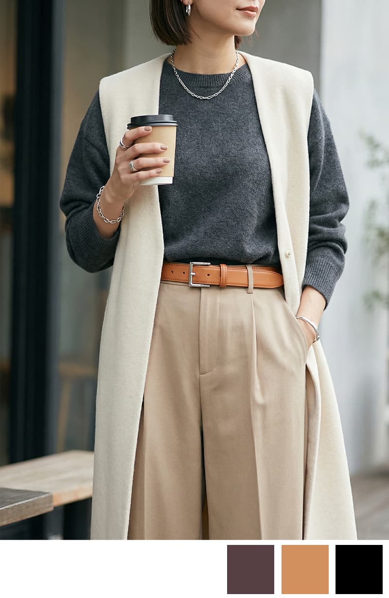 「今日、なんかいい感じだね」——そう言われる日は決まって、色選びに迷わなかった朝だ。ドライミントのシアーニットが春の光を透かし、アイボリーのワイドパンツがそのやさしいトーンをそのまま足元まで繋ぐ。レイヤード風のVネックは一枚で重ね着の奥行きを演出し、ブラックのリアルレザートートとベルトが甘さの中にピリッとした骨格を与える。友人との約束の30分前、鏡を見て「よし」と小さく頷ける——このスタイリングには、そんな静かな自信が宿っている。